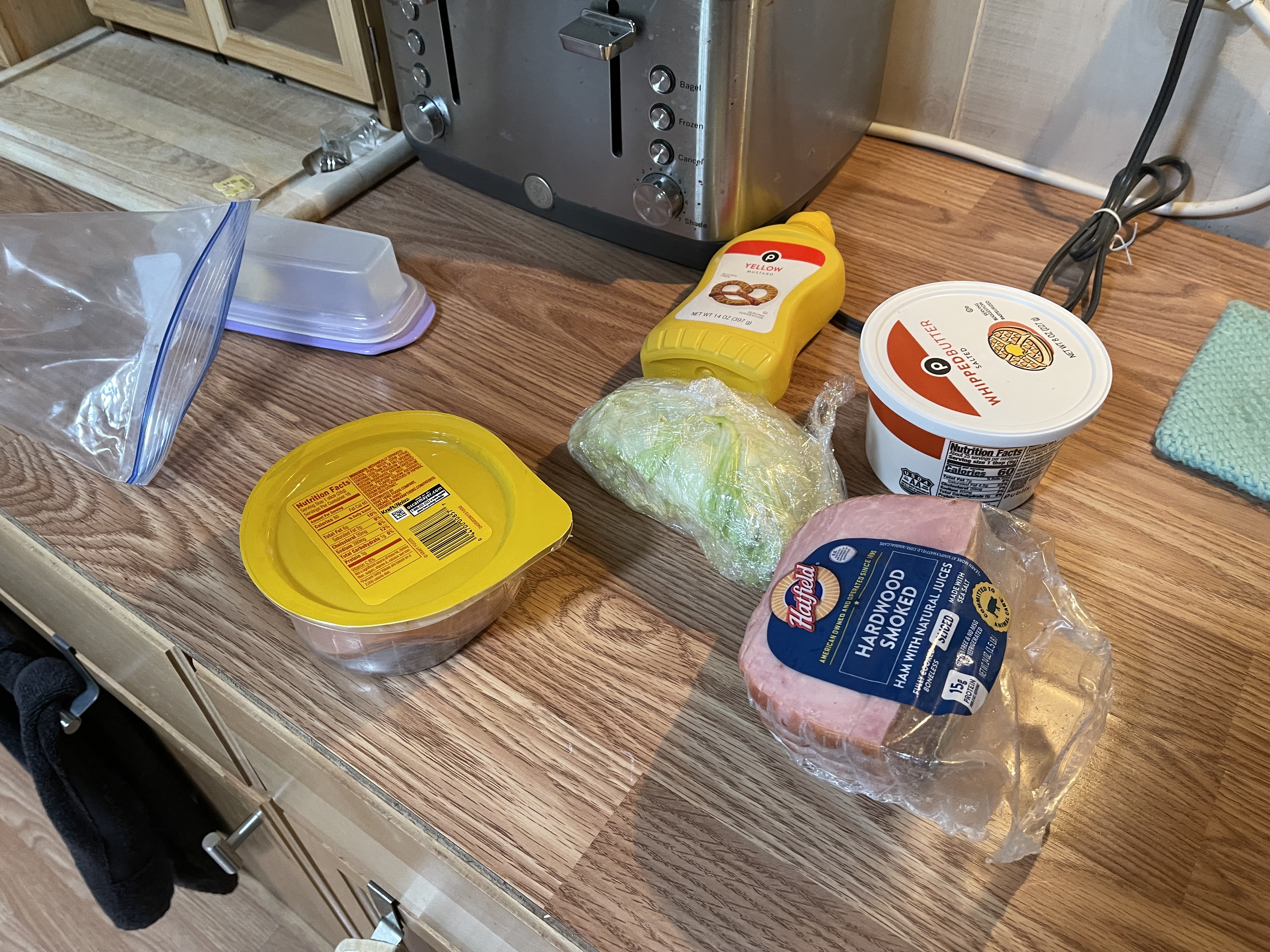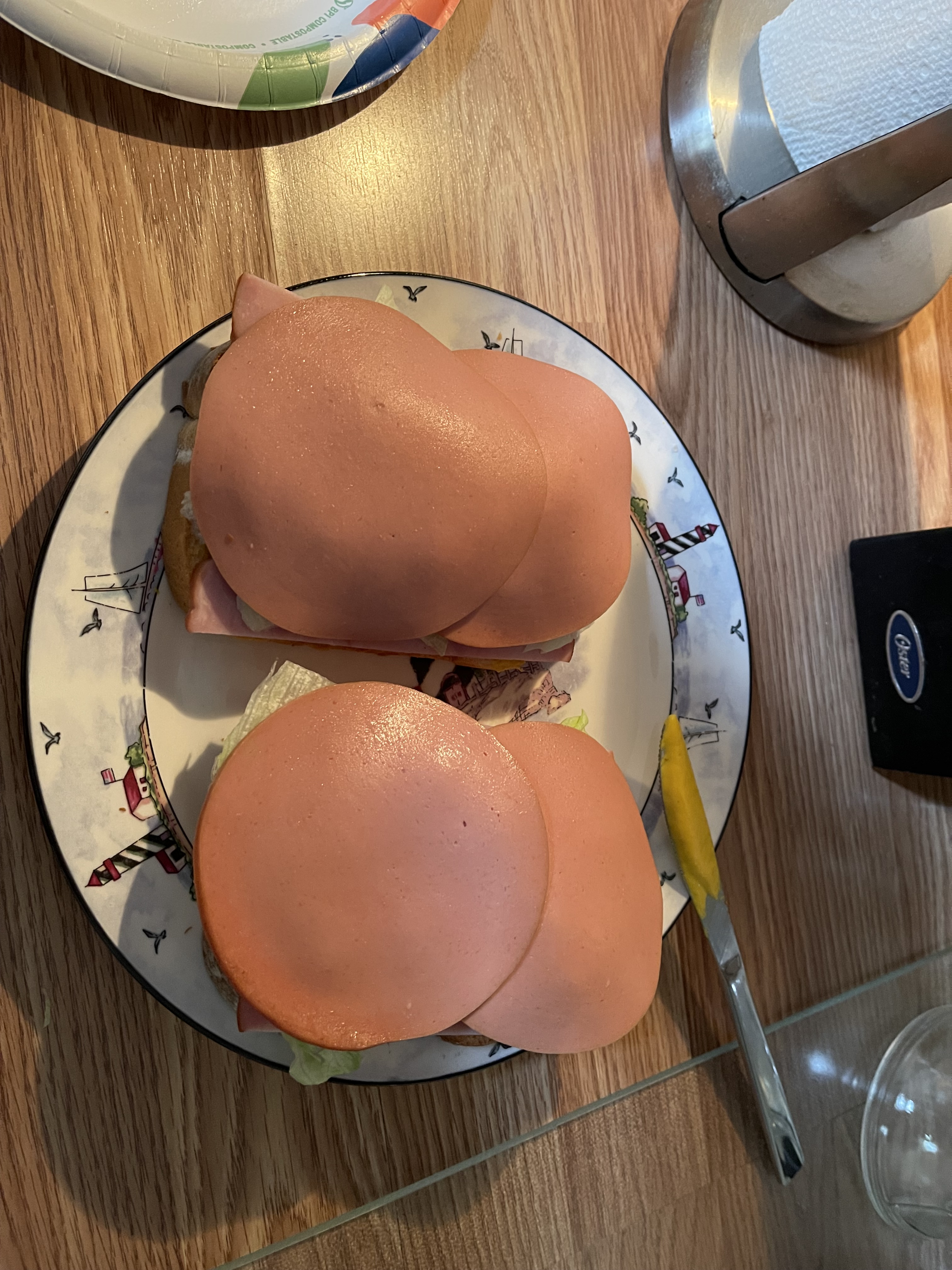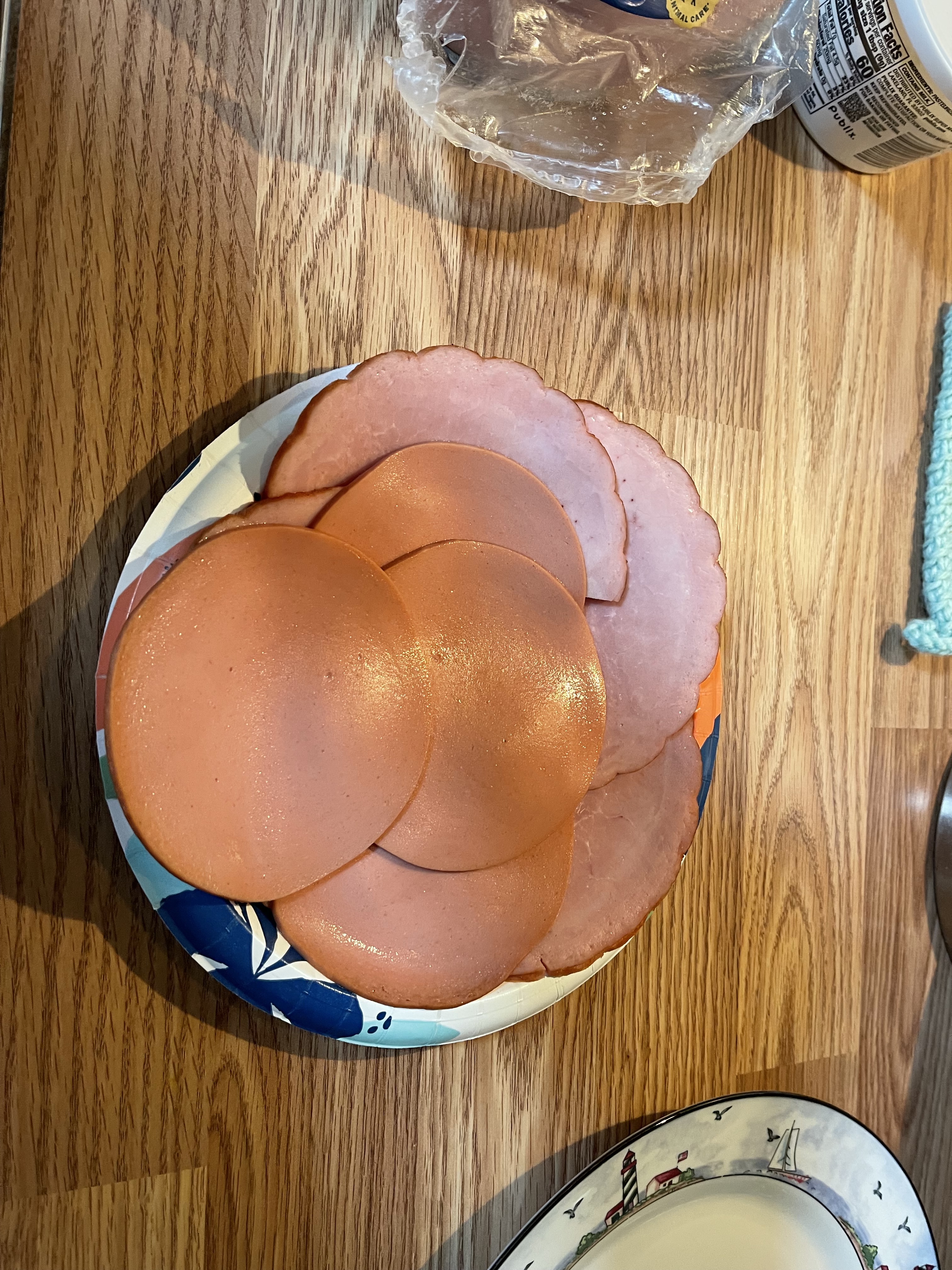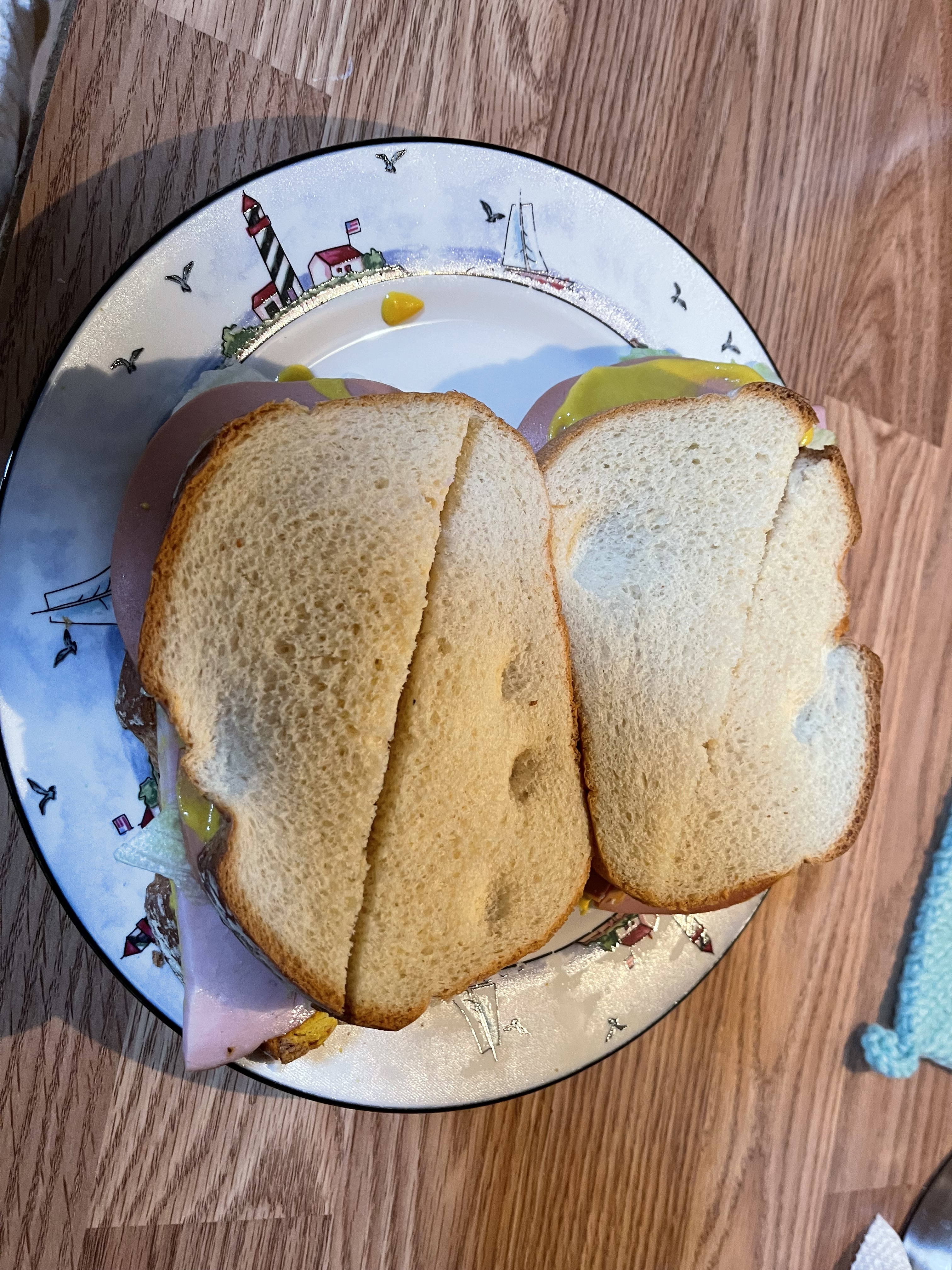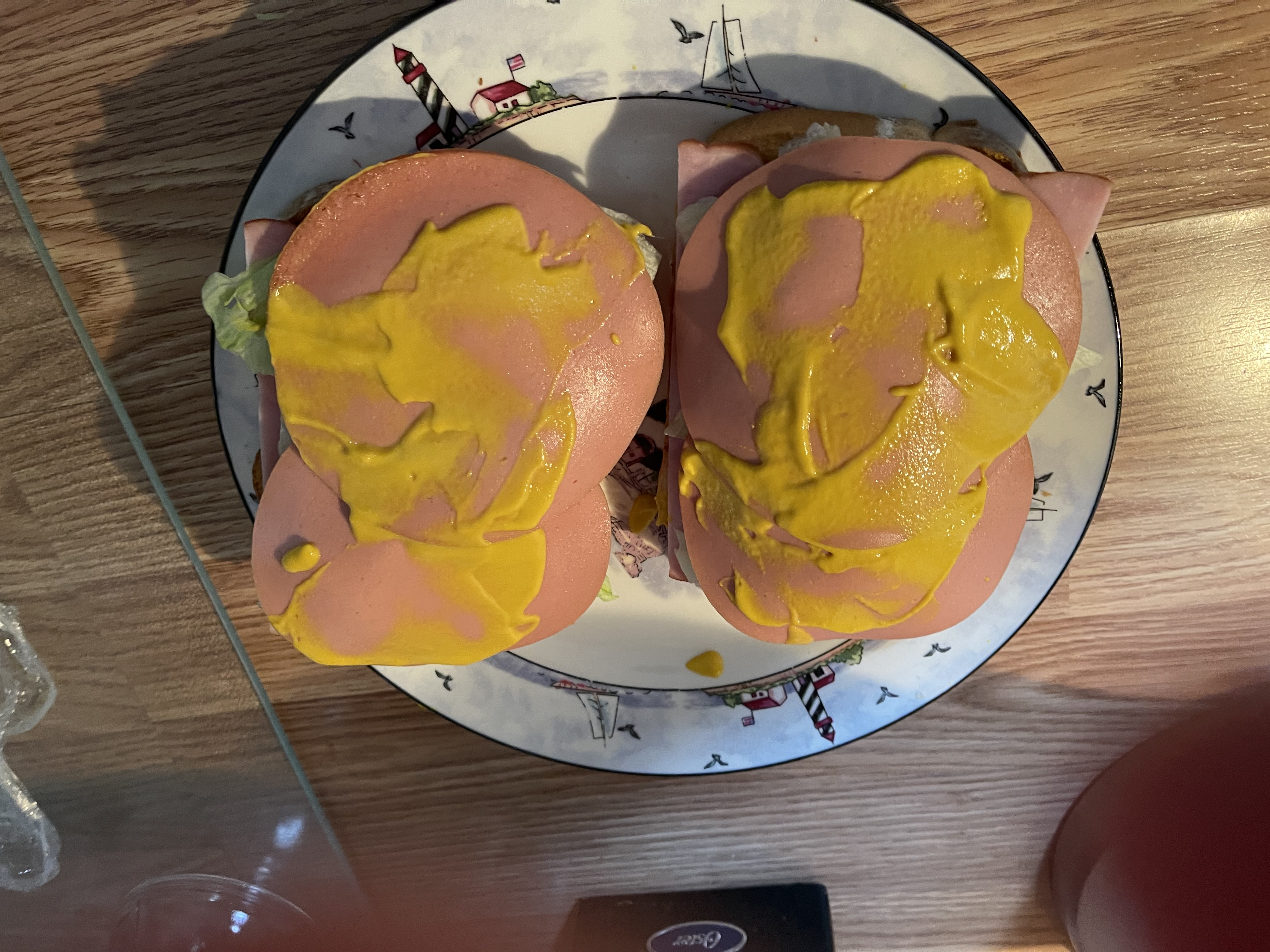 I start with heating the meats as I dislike cold foods. I then put the bread slices for two sandwiches on the plate and apply mustard to them.