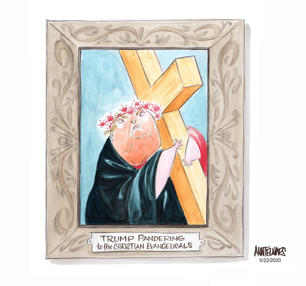 Hereโs an cartoon from 2020 when Trump pandered to Christian voters by demanding governors open houses of worship during the Covid pandemic shutdown.