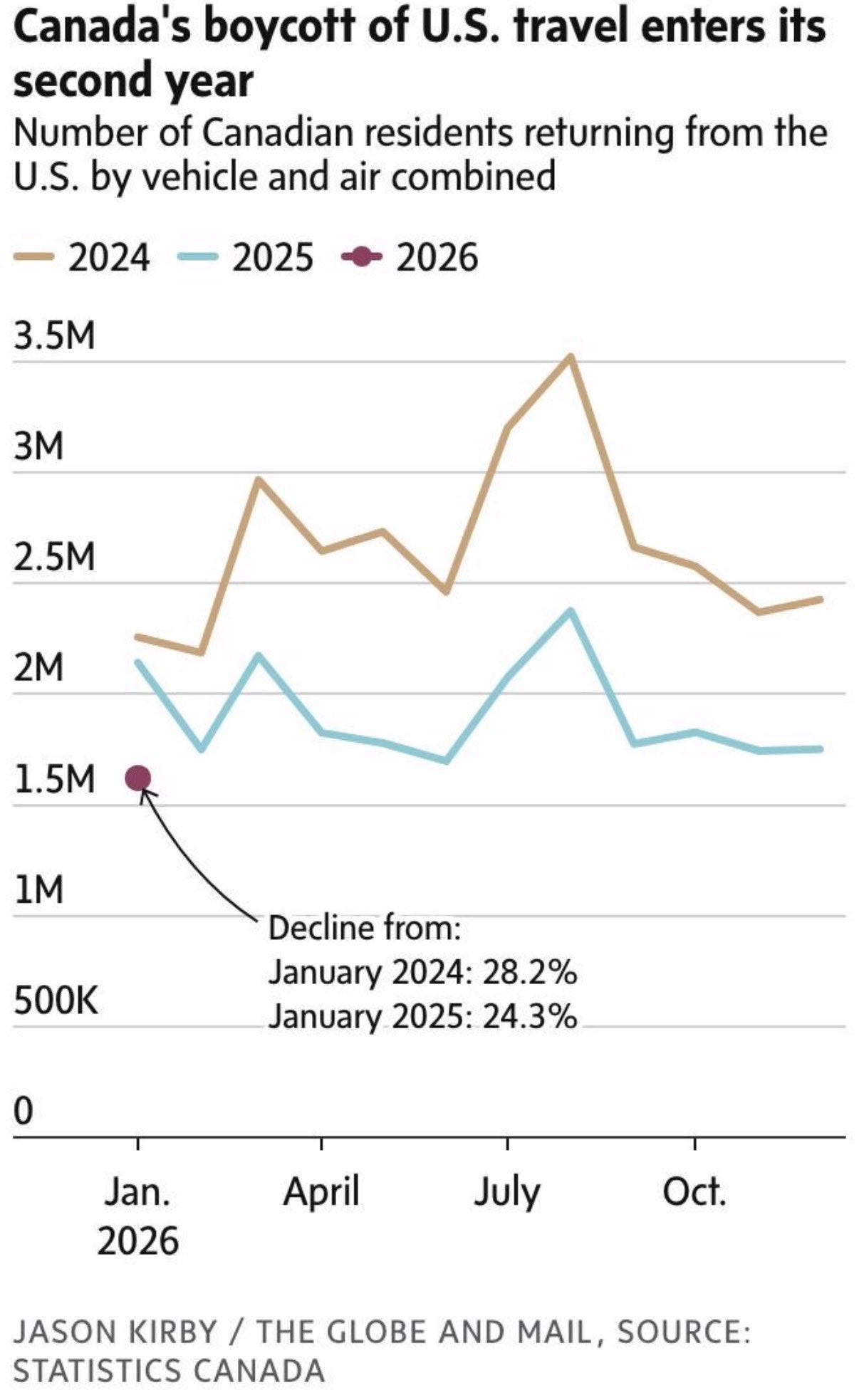 -Canadians have cut their travel to the United States for a second consecutive year, according to new data.