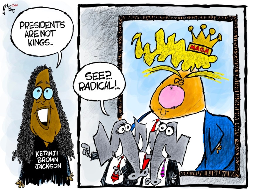 My editor asked for a cartoon on President Biden’s nominee to the Supreme Court, Ketanji Jackson Brown. I then saw an article where the chairperson for the Republican National Committee, Ronna McDaniel, had issued a statement about how “radical” KBJ is but nowhere in the statement did she mention what makes her so radical. So, I focused on that.