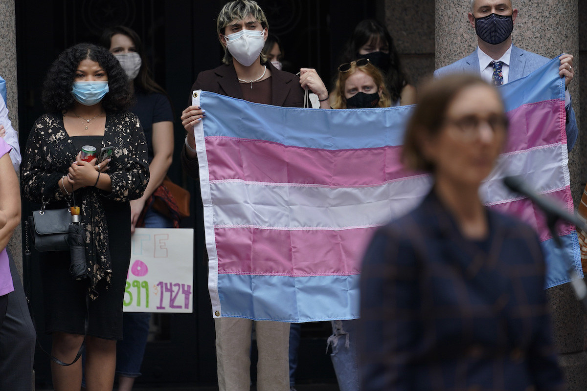 Left: Parents of transgender children gather in the capital to speak about transgender legislation being considered in the Texas House and Senate; right: Texas Gov. Greg Abbott