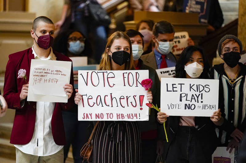 Protesters carry signs at a rally held in opposition to anti-LGTBQ bills being considered at the statehouse in Indianapolis, on Feb. 16, 2022.