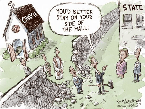 The Founding Fathers never ever intended church and state to operate together In fact it was quite the opposite They stated that state operated free and clear of church and church had the freedom to practice in is chosen manner but not interfering with state