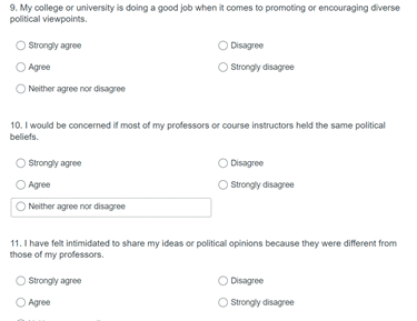 There are 13 total questions on the student survey that ask whether students feel their university or campus is a place where free political or belief expression can take place, and whether their professors create that environment and to what degree express their own political opinions.