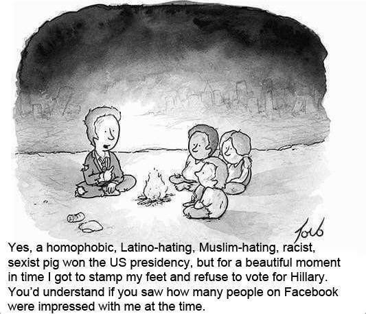 But she didn’t smile enough. And she was too shrill, and lecturing. And Benghazi. And her emails. And her pantsuits. And she just didn’t excite me. And she talked to Goldman-Sachs. And both sides are the same, anyway, so why bother?