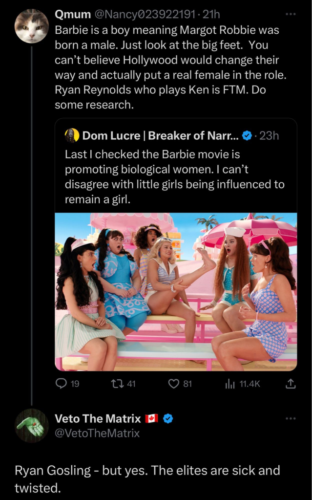 As you can see, you’ve got a mix of people convinced that the actress playing the character on the left in the green dress, Ana Cruz Kayne, is trans. Others are convinced that Margot Robbie, herself, is transgender. And then, just for good measure, there were people insisting that not only is Robbie secretly a trans woman, but that Ryan Gosling, who has been on TV since he was 13 years old, is secretly a trans man.