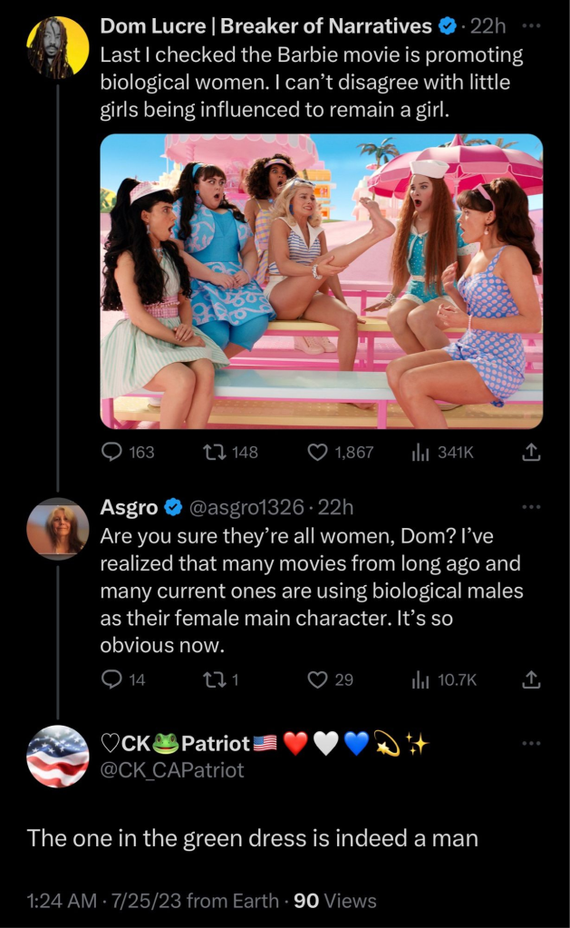 “Last I checked the Barbie movie is promoting biological women,” wrote Dom Lucre (a.k.a. Dominick McGee) on Twitter X. “I can’t disagree with little girls being influenced to remain a girl.” Attached to the tweet post was a photo of six of the film’s Barbies, including Nef (2nd from the right, wearing the sailor hat).