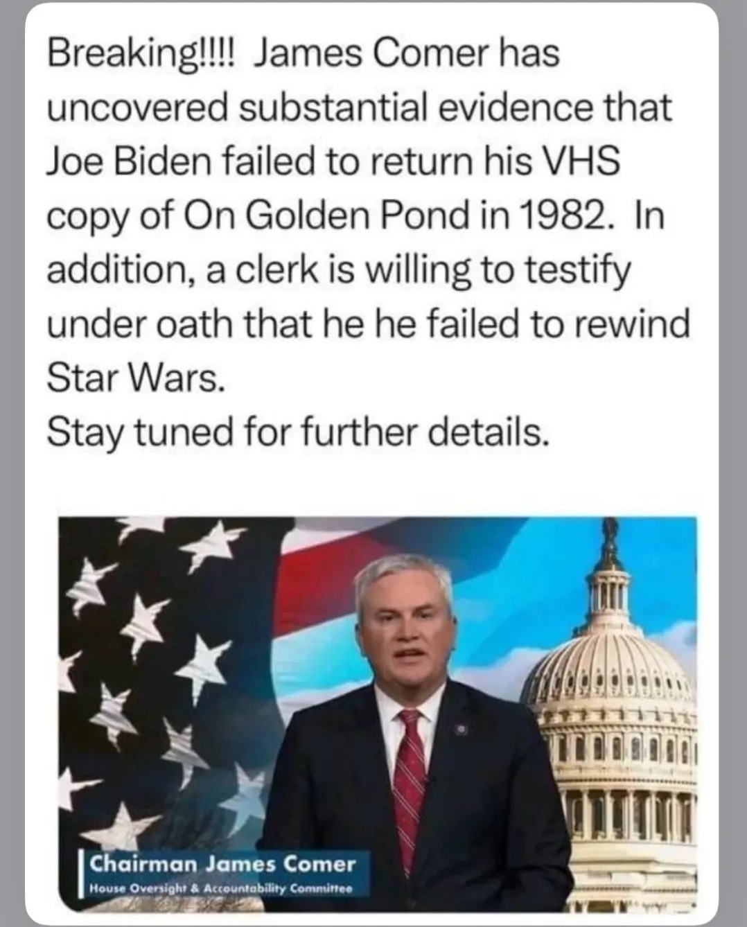 I look forward to Comer’s inevitable destruction focusing upon his white whale. The more noise he makes, the more he draws attention to himself, and his inevitable failure to actually find anything of merit. If anything, his attempts to spotlight crimes on the Bidens seem to shine that same spotlight on his own dubious financial affairs, corruption & immorality.