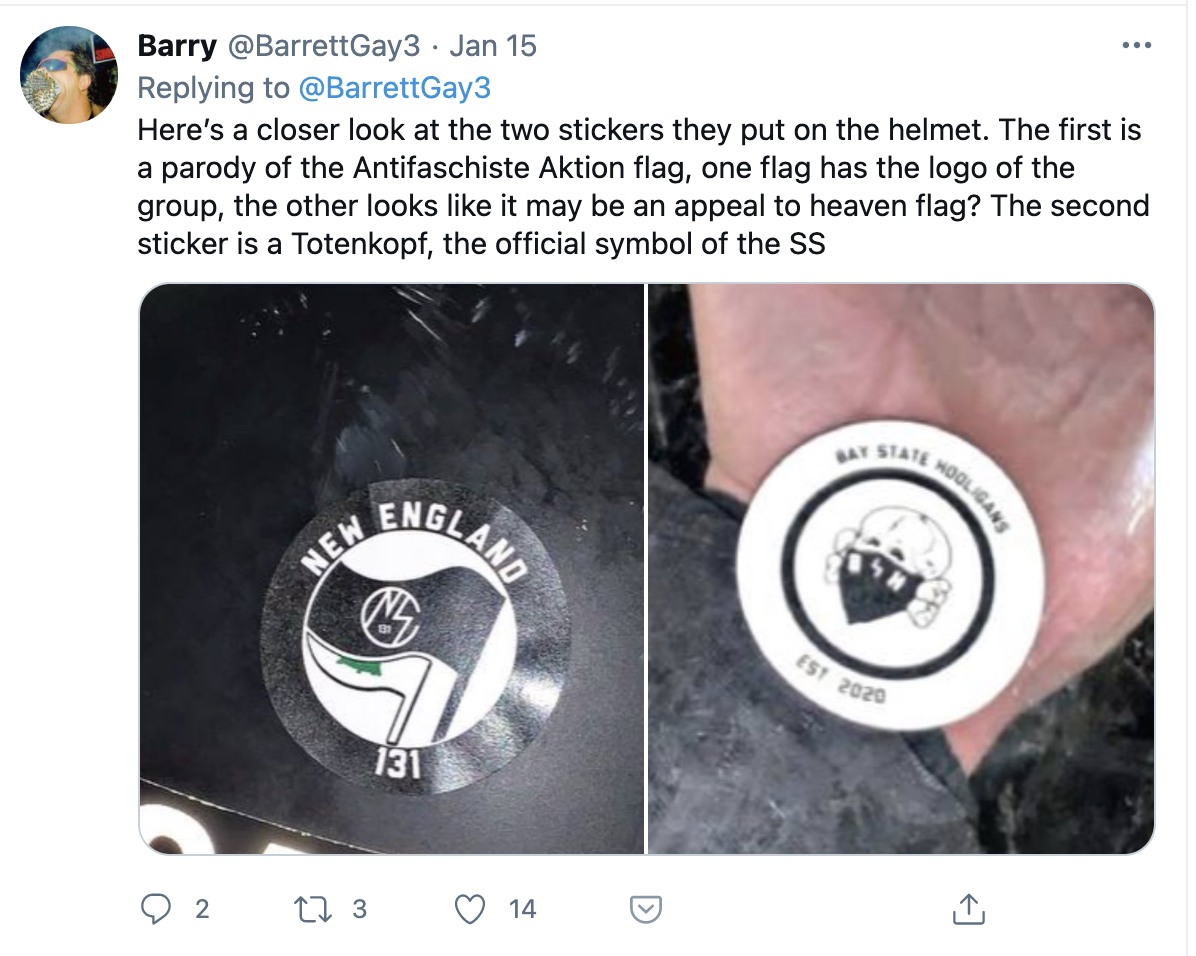 The flag continued to show up even after the Capitol riots. On Jan. 15, Barrett Gay, an independent journalist who reports on fascism, tweeted photos of members of the neo-Nazi group, NSC-131, showing off a stolen riot helmet decorated with two flags: a parody of an antifascist flag and the Pine Tree flag.