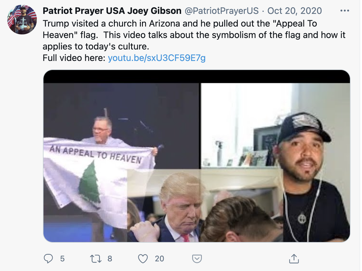 The flag crops up in Christian circles other than Sheets’ “Appeal to Heaven” movement, too. It was seen flying at the National Mall at an October anti-lockdown “Worship Protest,” which called for the reopening of churches.