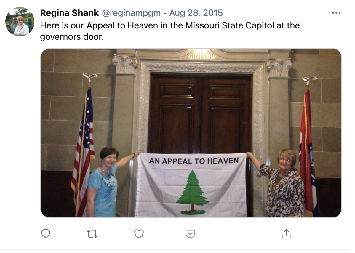 Arkansas Republican state senator Jason Rapert is also frequentlyphotographed with the flag. Rapert is the founder and president of the Christian ministry, Holy Ghost Ministries, and of the conservative group, National Association of Christian Lawmakers, whose stated aims are to, “bring lawmakers together in support of clear biblical principles.” He often adds the hashtag #AppealToHeaven to his social media posts, like in this homophobic tweet aimed at Pete Buttigieg. In 2019, Rapert was a guest speaker at one of Dutch Sheets’ “Appeal to Heaven” conferences.