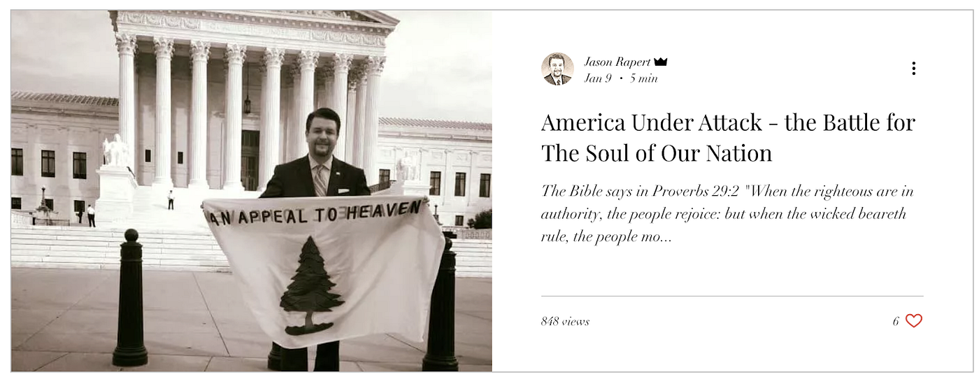 It’s impossible to know whether all of the above uses of this flag were explicitly intended to be in support of Christian Nationalism or Christian Dominionism. But given its association with Sheets’ overtly Christian Nationalist and Christian Dominionist “Appeal to Heaven” movement, its presence at the Christian Nationalist “Appeal to Heaven” rally in Greenville, and its abundance at the Capitol insurrection amidst many believers of Christian Nationalism, clearly the flag has some association with these movements. And instances of elected officials who pursue a conservative religious agenda such as Pennsylvania state senator Doug Mastriano peddling the flag bolsters this association.