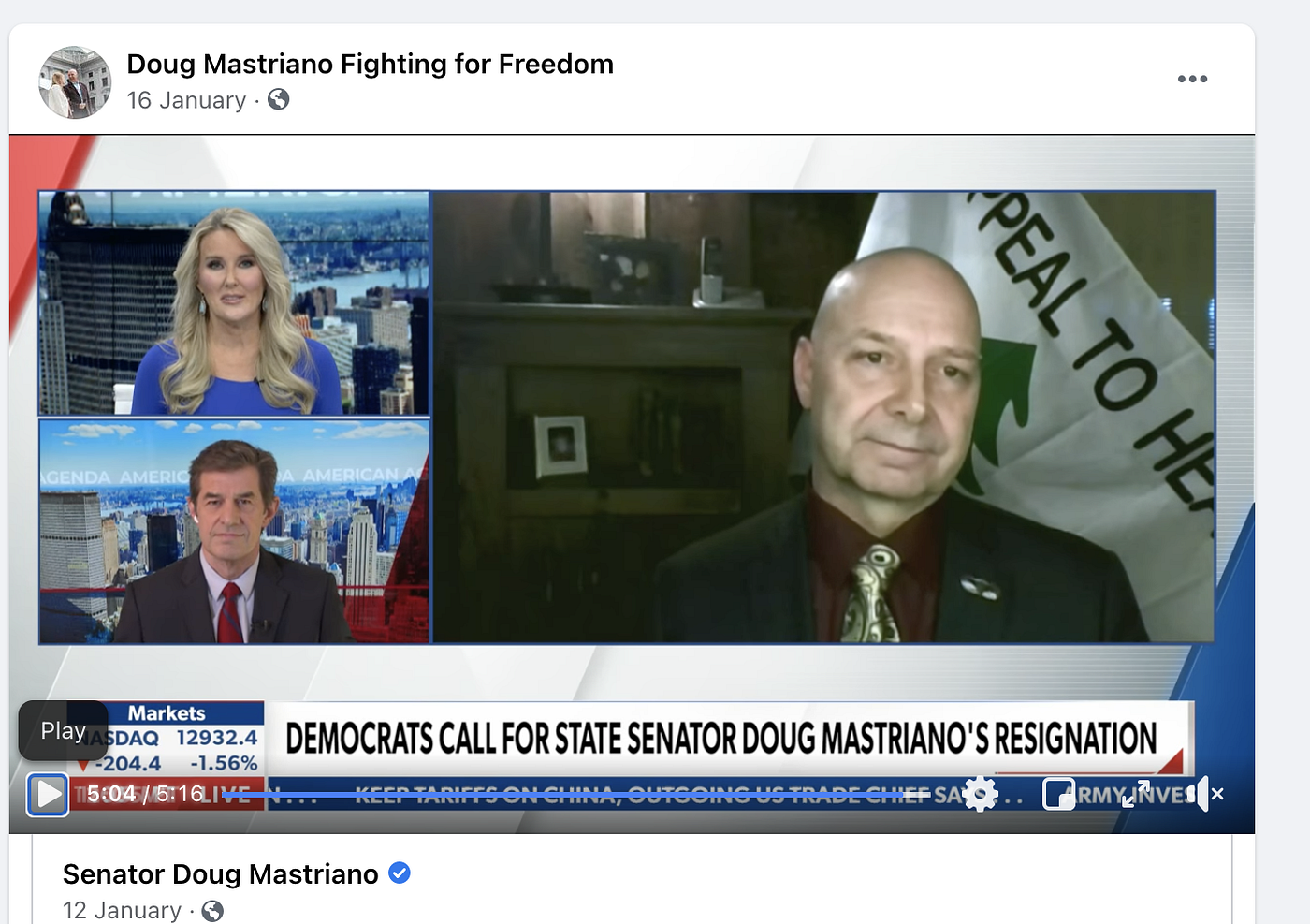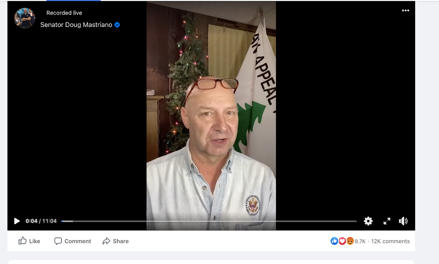 After attending the “Save America” rally on Jan. 6, a Republican state senator from Pennsylvania, Doug Mastriano, released a Facebook Live video speaking in front of the Pine Tree flag. It appears behind him in an interview with conservative television network Newsmax (Newsmax repeatedly promoted baseless claims about voter fraud in the 2020 Presidential Election). The cover photo of his self-described personal Facebook page is also the Pine Tree flag.