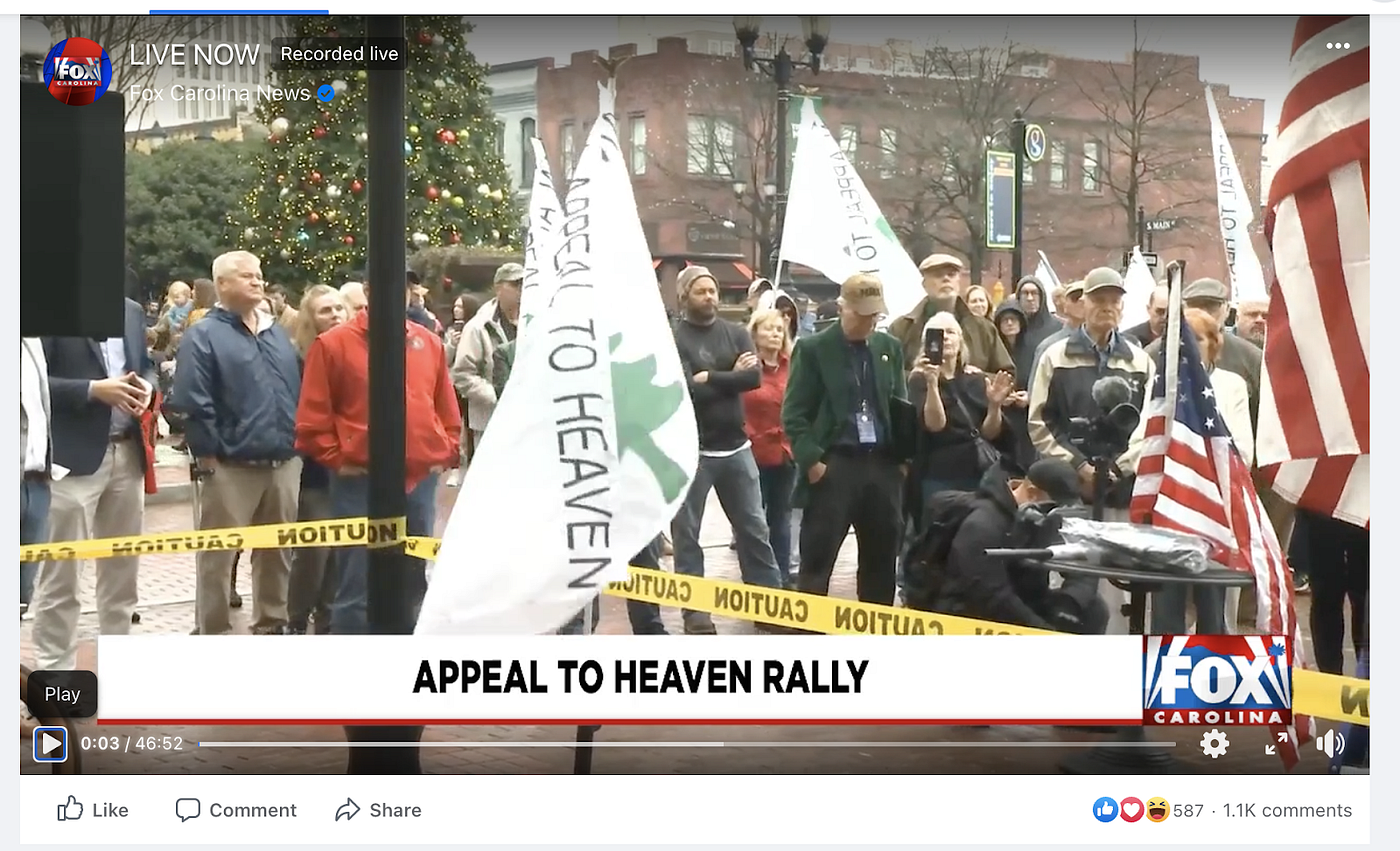 In 2021, four days before the events at the Capitol, the flag was prominently featured at an “Appeal to Heaven” rally in Greenville, South Carolina. Speakers and protestors had gathered to advance Christian interests and representation in politics. The tone was openly Christian Nationalist, with one speaker declaring that “we have designed [the United States] after [God]”.