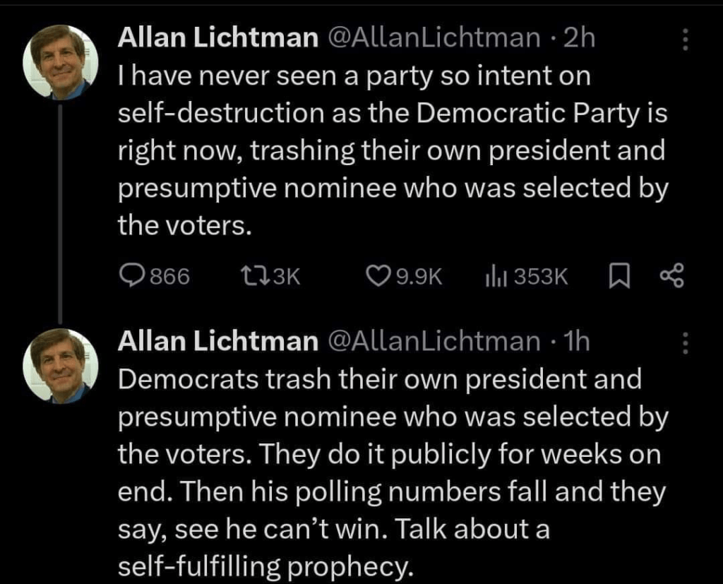 The Democratic Party attacked and ate their own while the Republican Party celebrated and endorsed their convicted molester and criminal authoritarian thug candidate who is demonstrably cognitively impaired. Need any more be said. One party says reality be damned we just claim what we want and threaten those who disagree, the other party worries that they may hurt their own chances and doesn’t back their candidate out of fear. Guess who will win in a war. One party doesn’t give a shit what people think, doesn’t care one bit about reality, ignores and vilifies the press, the other party cowers and tries to please every interviewer with an agenda that won’t listen to their replies. The media was desperate for a horse race, for more media clicks and interest in their posts / shows. The democrats gave in to them. The democrats caused tRump to win. Hugs. Scottie