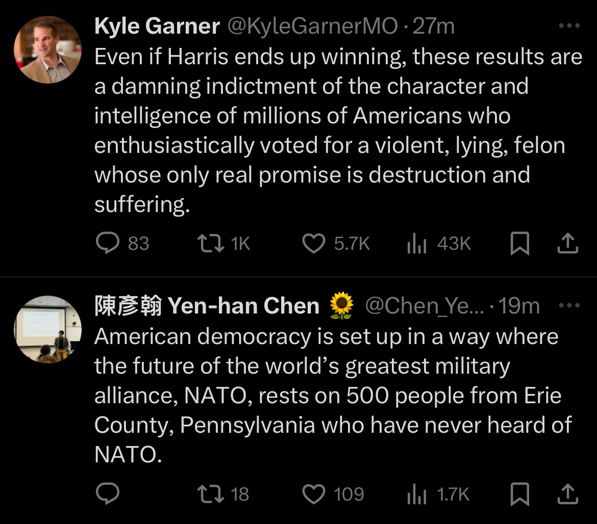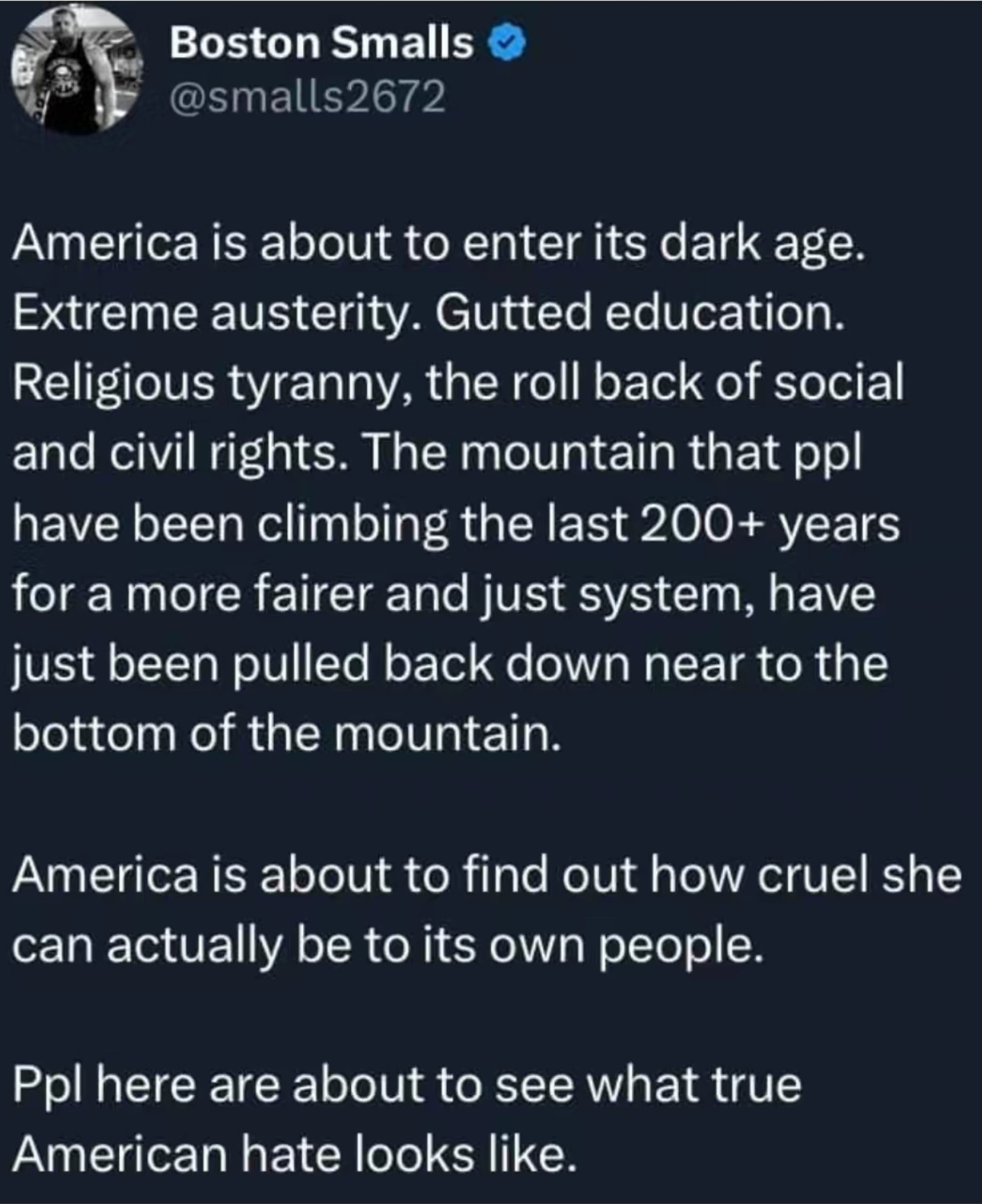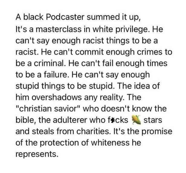 “As an American, I’m out of fucks to give for my fellow Americans. It’s been almost 10 years to see who he really is, and 3/4 of us either LIKE that or are too ignorant to care.