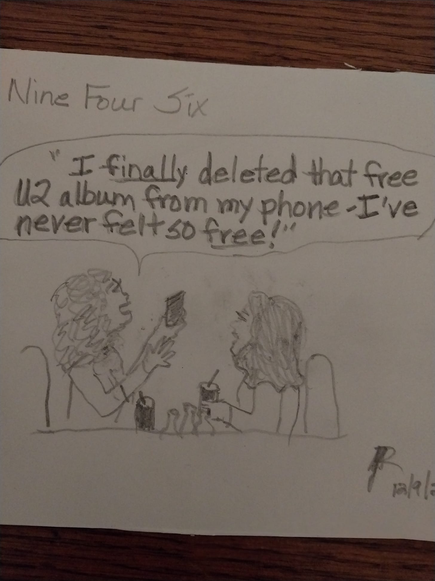 Ali thought my cartoon was funny even though, she confesses, she’d never previously heard about the free U2 album that mysteriously appeared on peoples’ phones ten years ago. It occurred to me while I was writing it that I might mystify some of my younger readers. So yeah, while they were rolling out a new iPhone a decade ago, Apple and U2 rather presumptuously “gave” all iPhone users this new U2 album. Everyone woke up with it on their phone and just felt… invaded. Even U2 fans were a little put off. I think it bothered people to discover that they were not in charge of their own phone.