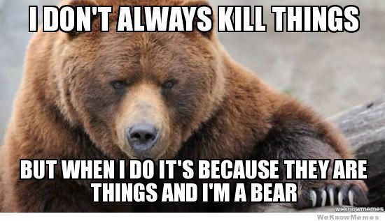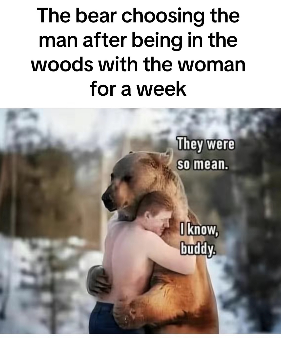 1. The bear would seriously choose a man over a woman? At first I thought that meant the bear chose the man as prey over the woman, because the bear felt bad about how so many men treat women. Guess meme makers don’t feel that way.