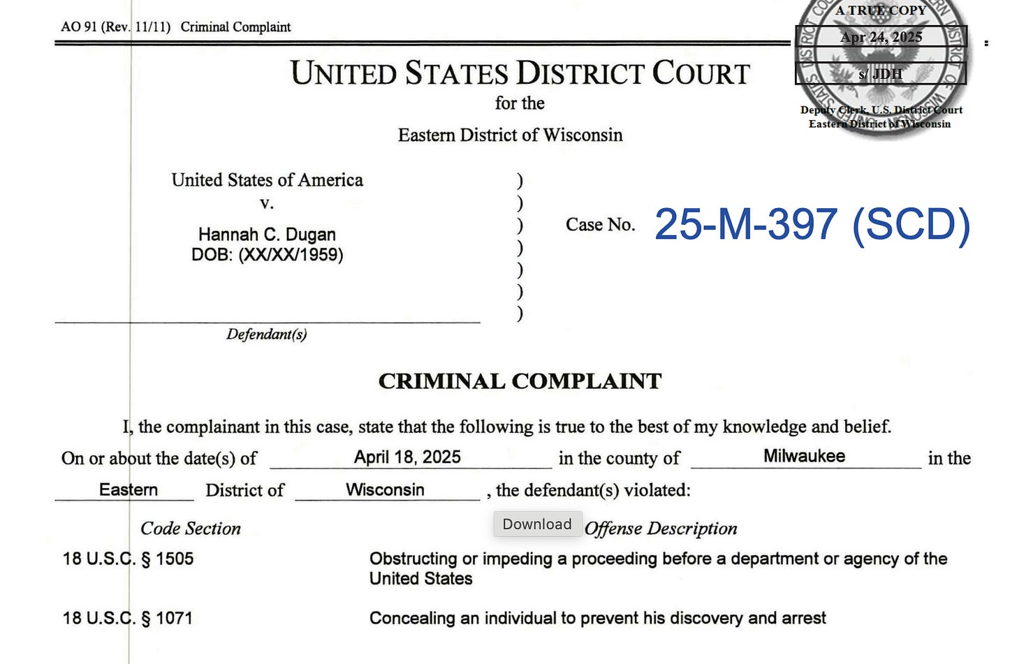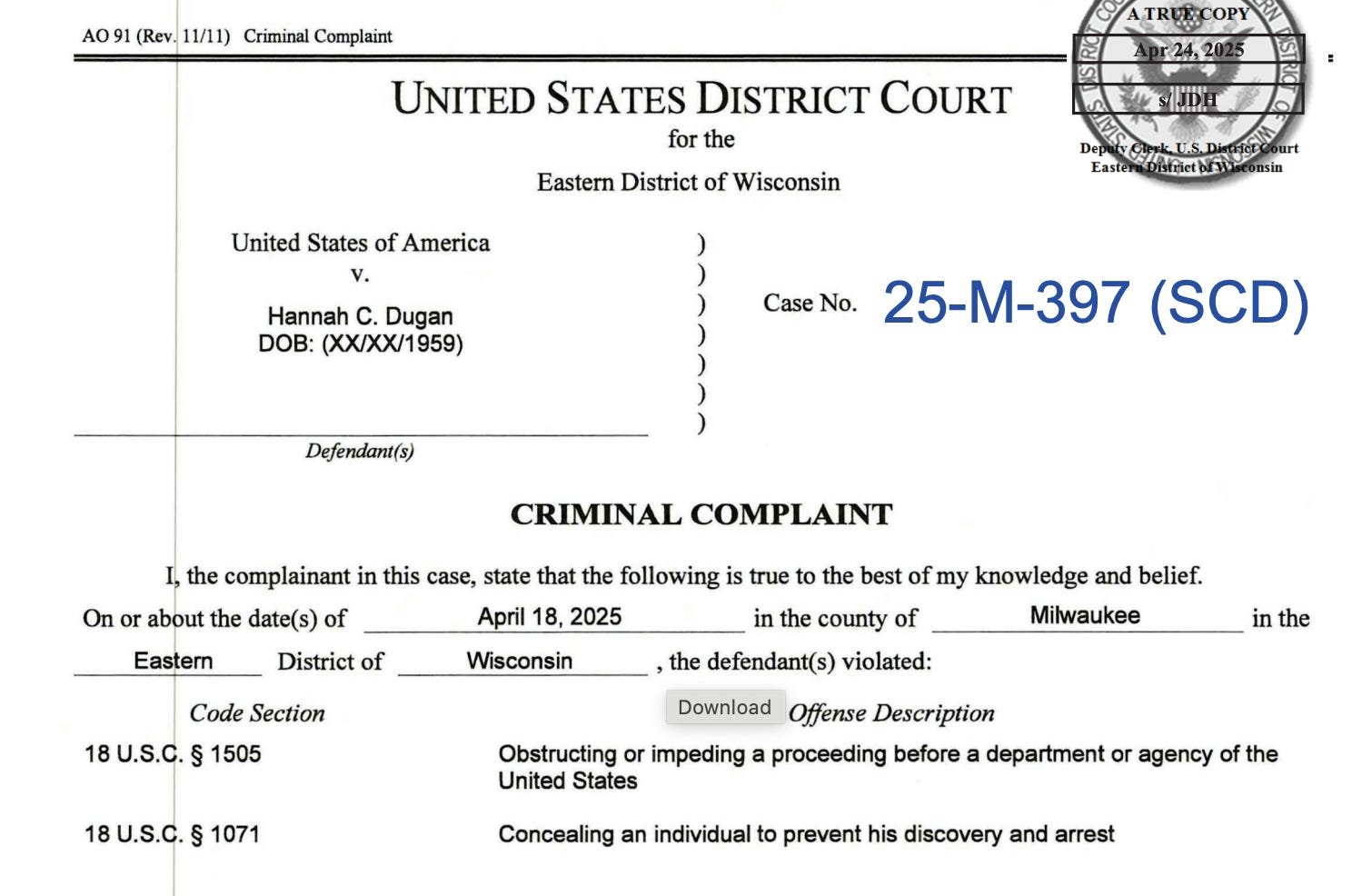 Dugan is charged with obstruction of proceedings before a department or agency of the United States, which carries a maximum penalty of five years in prison, and concealing a person to prevent arrest, which carries a maximum penalty of one year in prison. The allegations relate to efforts by federal agents to arrest a Mexican national, Eduardo Flores-Ruiz, on charges of illegally reentering the United States after being deported. He had not been indicted, and the warrant for his arrest was an administrative warrant issued by ICE, not a warrant issued by a federal judge. Flores-Ruiz was in Judge Dugan’s courtroom on misdemeanor assault charges—no one is saying he shouldn’t face both the state and federal charges.