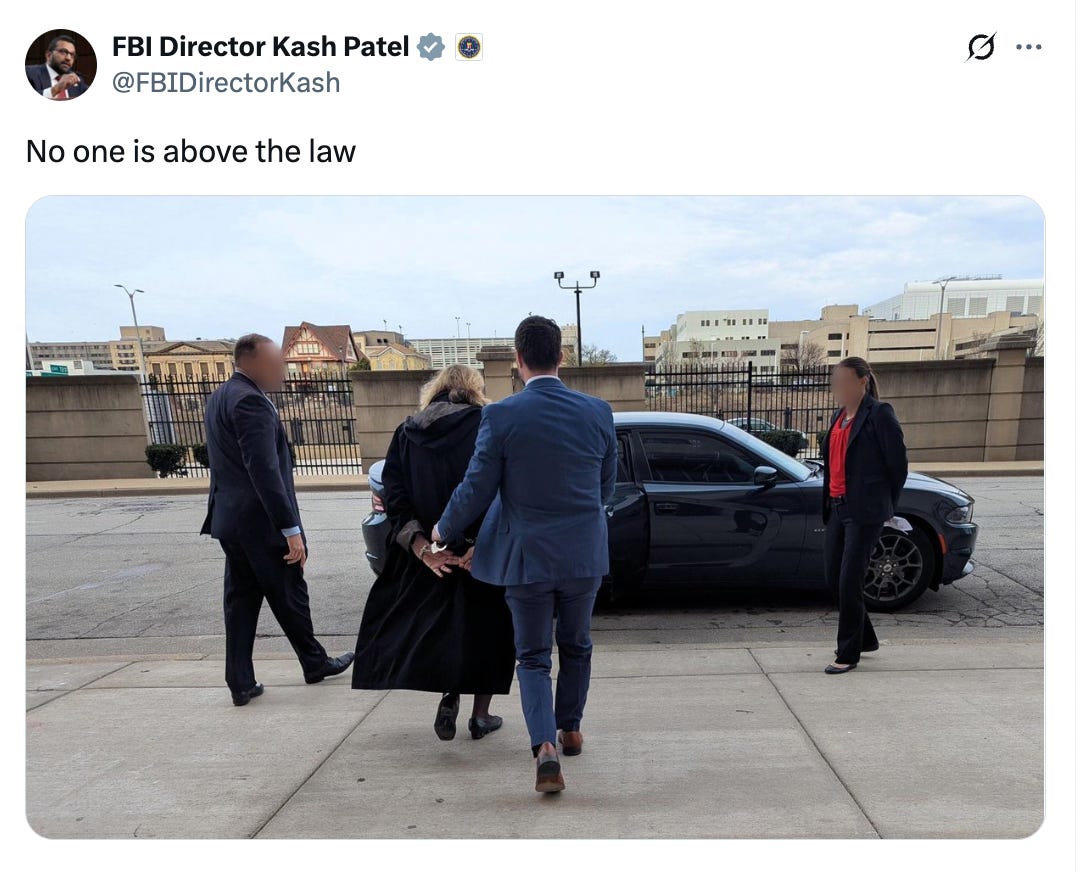 Judges across the country are undoubtedly wondering what sort of trumped-up charges might be used to storm into their courtrooms and arrest them if the attorney general of the United States doesn’t like the way they’re keeping order and conducting the people’s business in their courtrooms. Arresting judges isn’t something we should have to worry about in a democracy. But after Friday’s events, where federal agents arrested Milwaukee, Wisconsin, Judge Hannah Dugan to the loud cheering of their bosses, Attorney General Pam Bondi and FBI Director Kash Patel, it’s one more marker of the country’s constitutional distress.