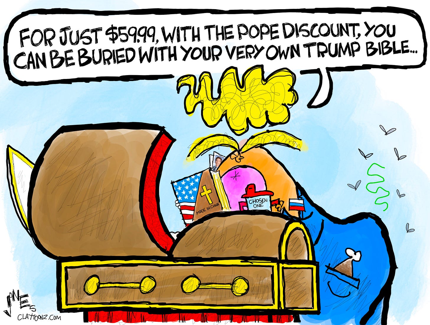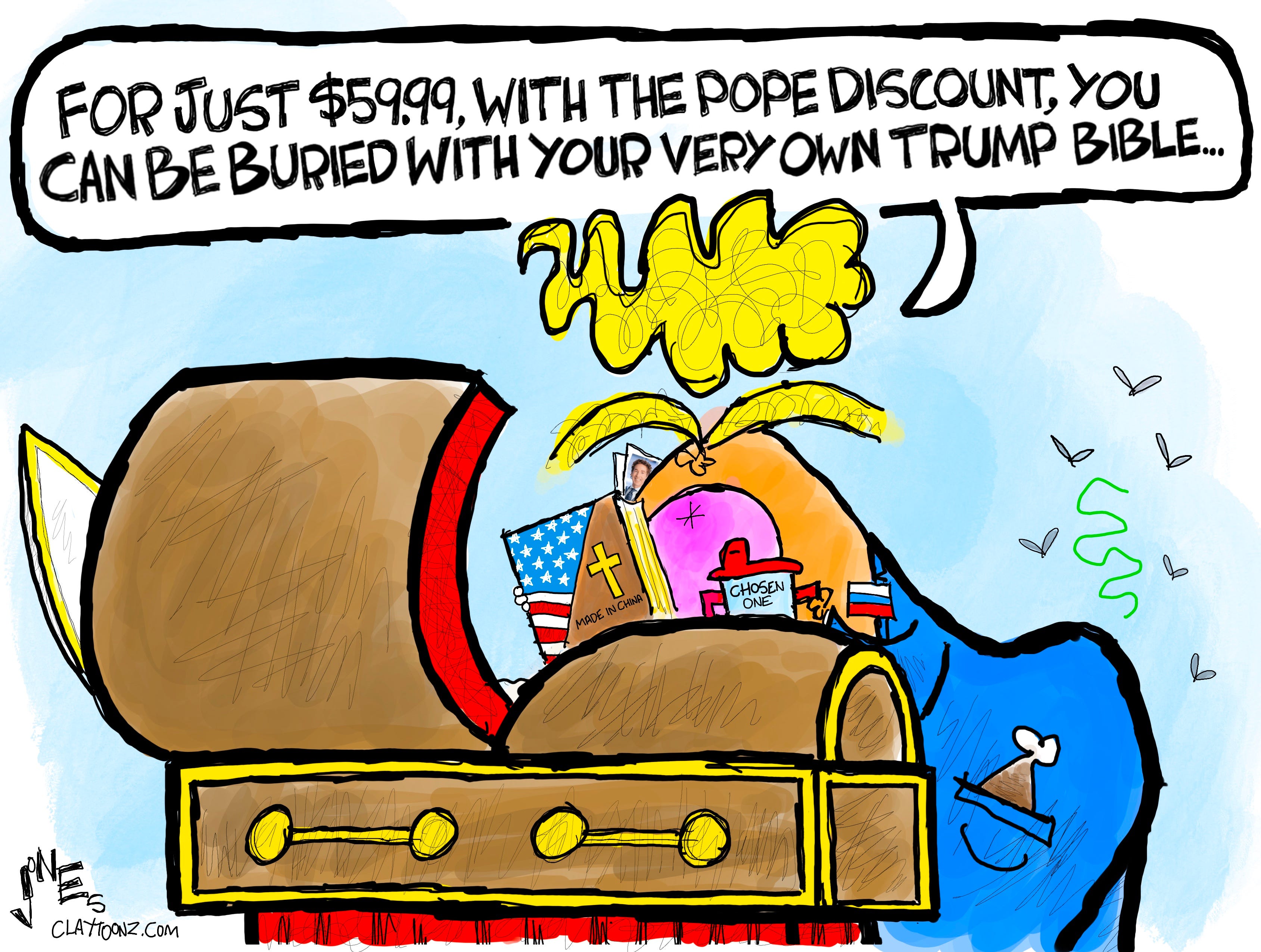 For just $59.99, with the Pope discount, you too can be buried with your very own Trump Bible. It’s the number-one Bible favored by dead popes, and will help you skip the line as it’ll impress St. Peter. Be the envy of all the other dead popes with your very own Trump Bible. For a limited time only, you can get two Trump Bibles for $119.00 in what we call the MyPillow Special! Act fast, as supplies are limited and tariffs are coming. The Trump Bible is the Popeiest!