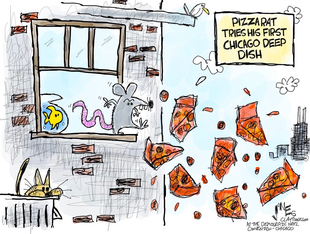 Shout-out and dedication: I dedicate this cartoon to Greg Zaborniak, who introduced me to Old Style beer and tavern-style Chicago pizza last year during the Democratic convention. Thank you again, Greg.