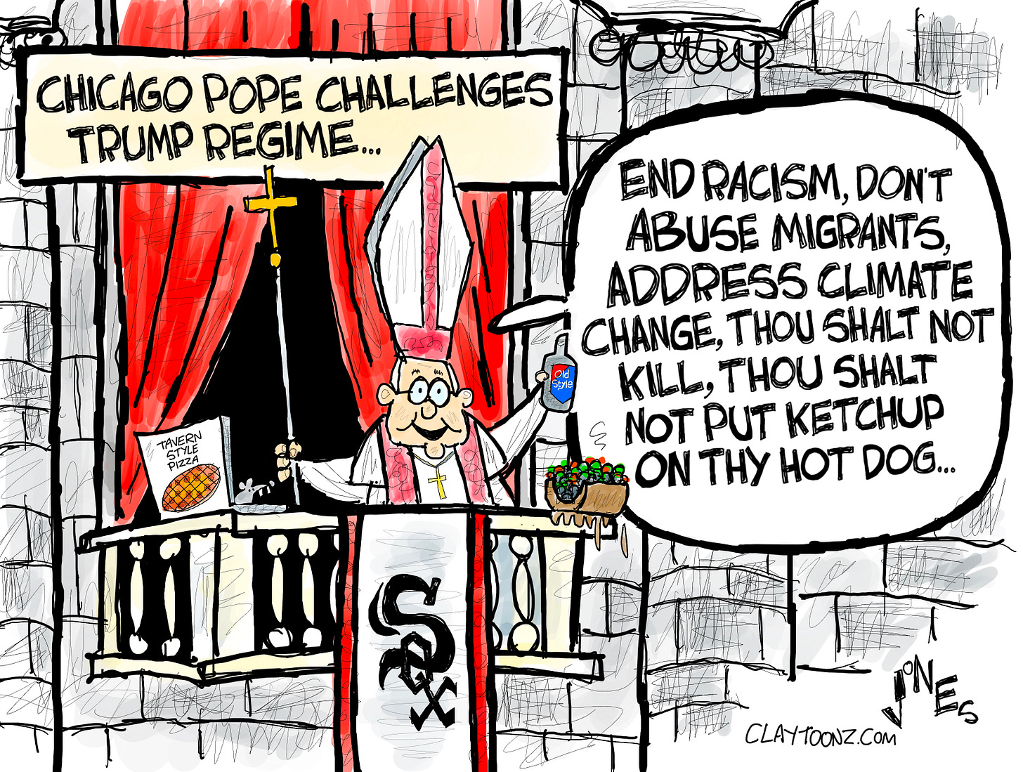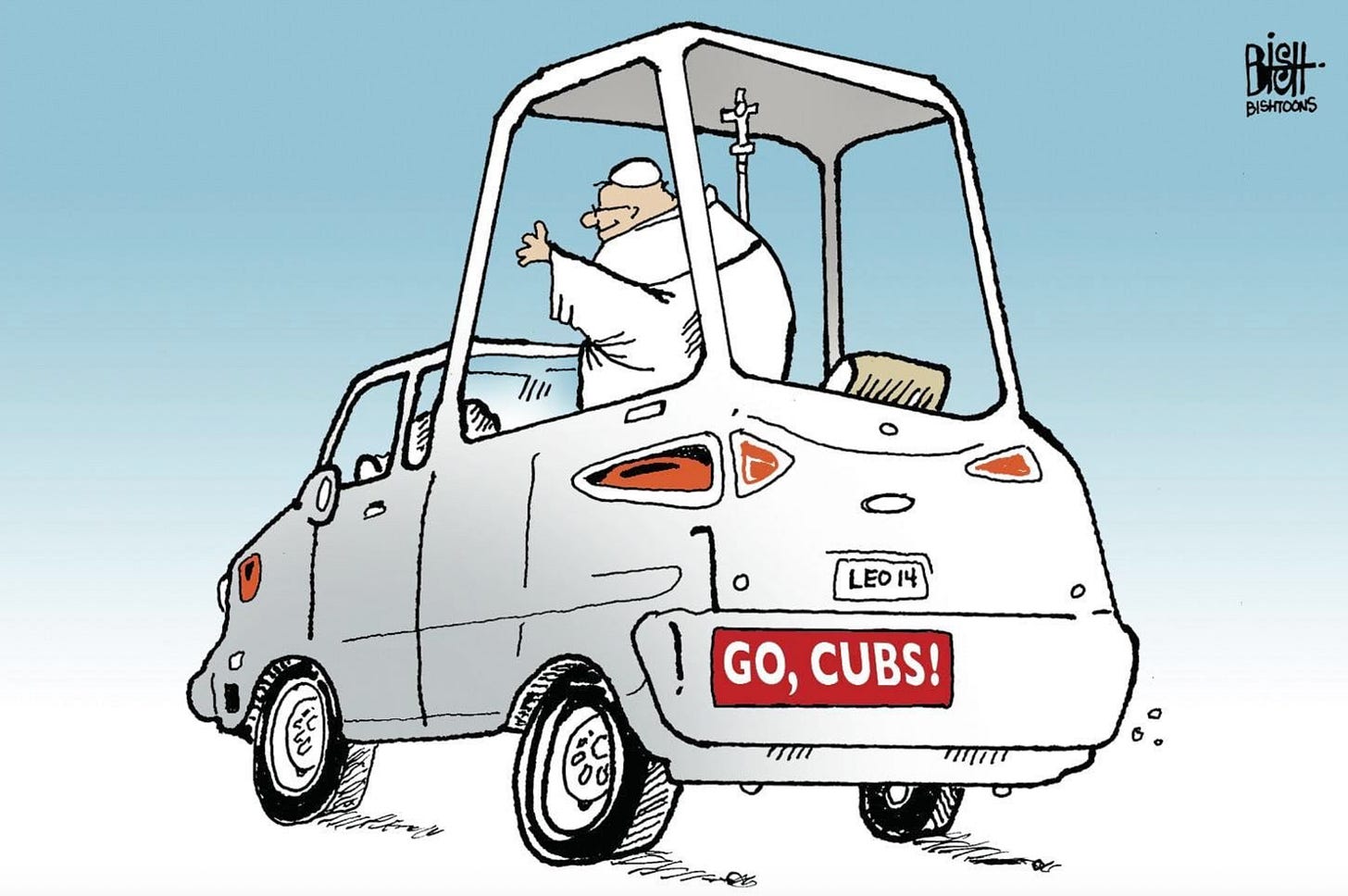 One of the first things I was curious about with our Chicago pope was if he is a Cubs fan. The Chicago Cubs posted on their famous marquee above Addison Street at Wrigley Field that Pope Leo is a Cubs fan. They got it wrong. So did some cartoonists.
