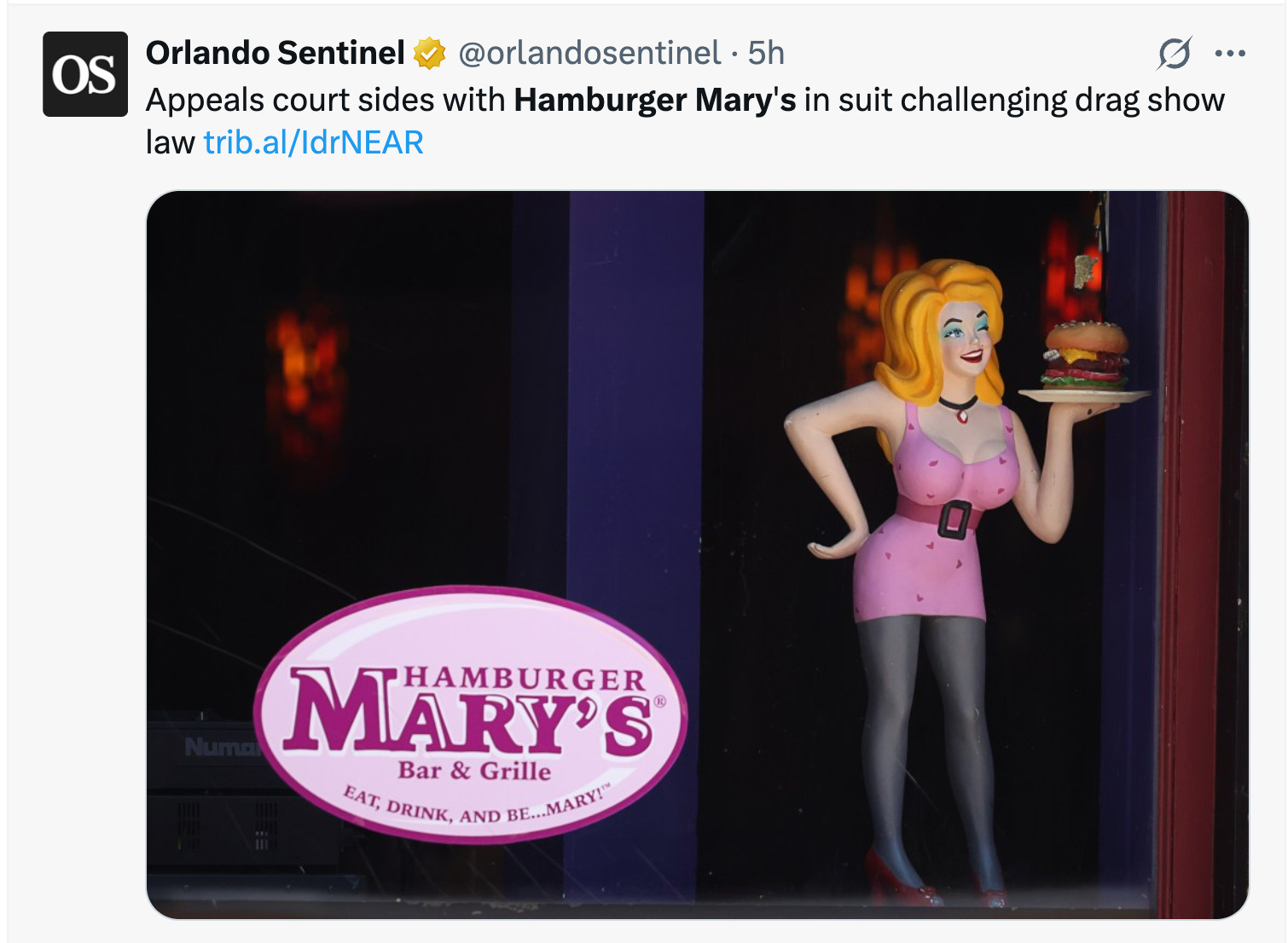 On Tuesday, the Eleventh Circuit Court of Appeals decided HM Florida-ORL, LLC v. Sec. of Florida DBPR, a case involving Hamburger Mary’s, a restaurant and bar in Orlando that regularly hosted drag performances, including family-friendly shows. When the Florida legislature passed SB 1438 in 2023, Hamburger Mary’s canceled its family-friendly drag shows and prohibited minors from attending any of its other shows out of fear of losing its business and/or liquor license. As a result, Hamburger Mary’s lost 20% of its bookings.