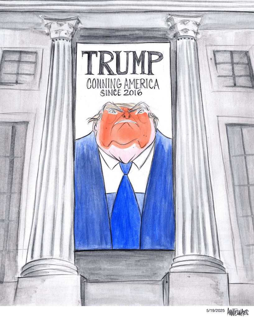 I’d say he’s been conning America for far longer than that, but that’s hard to fit on a banner
