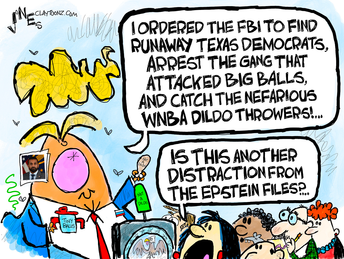 The FBI is now officially politicized. There are reports that Director Kash Patel, who’s not just a joke as director of the FBI (an organization he once said should be destroyed), but also as a human being, has assigned 1,000 agents to comb through the Epstein Files to flag mentions of Donald Trump. Now, he’s sending FBI agents after Texas state Democratic senators who’ve fled to other states so Republicans can’t build a quorum to vote on gerrymandering.