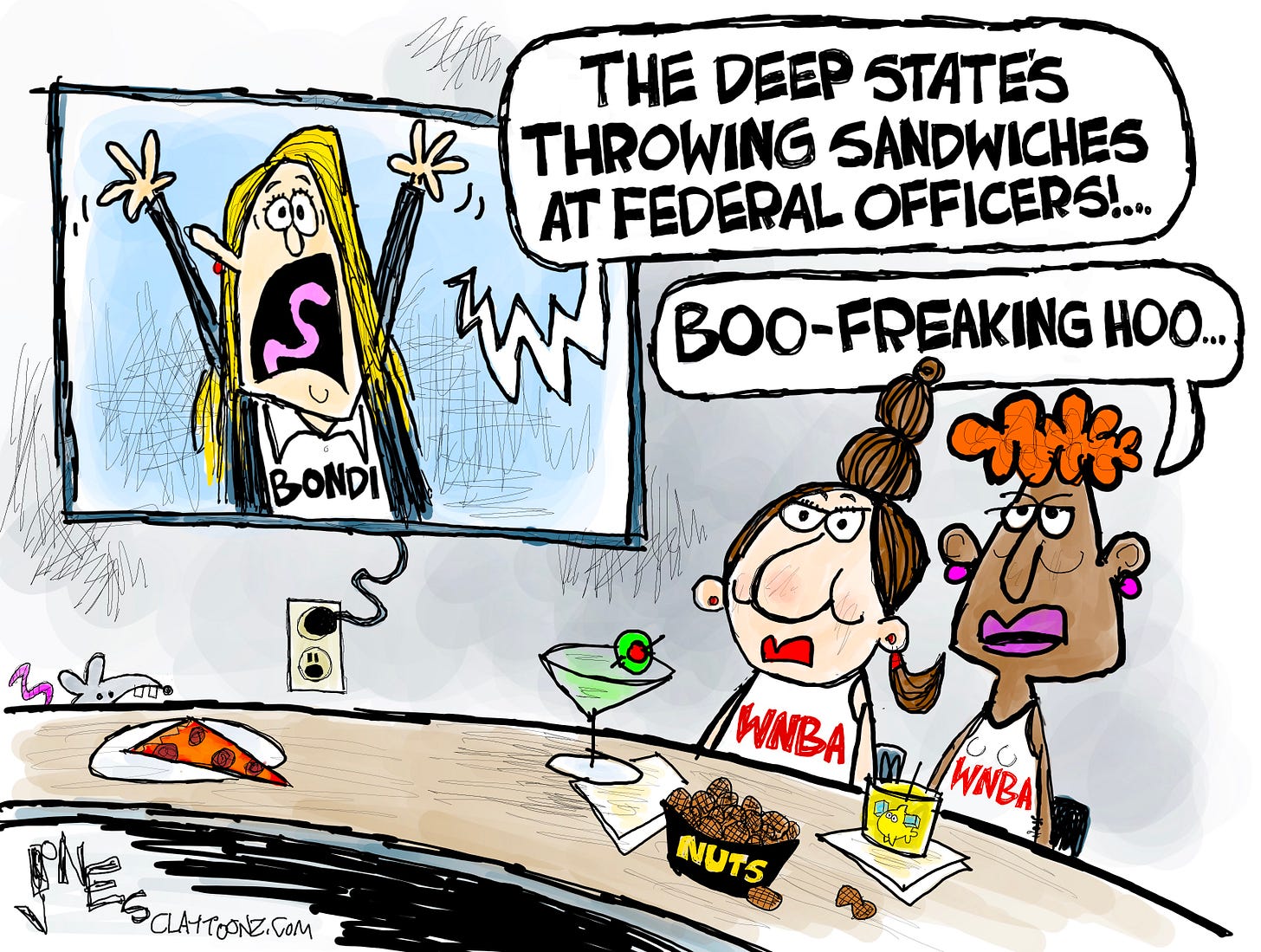 Attorney General (ha!), Pam Bondi said, “This is an example of the Deep State we have been up against for seven months as we work to refocus DOJ.” That’s not a joke. She literally tweeted that. J6 was a little harmless protest, and the real danger is these deep-state sandwich fuckers. First, they sex traffic babies out of the basement of a DC pizza parlor, and now they’re throwing sandwiches at federal law enforcement. (snip-but wait, there’s MORE!)