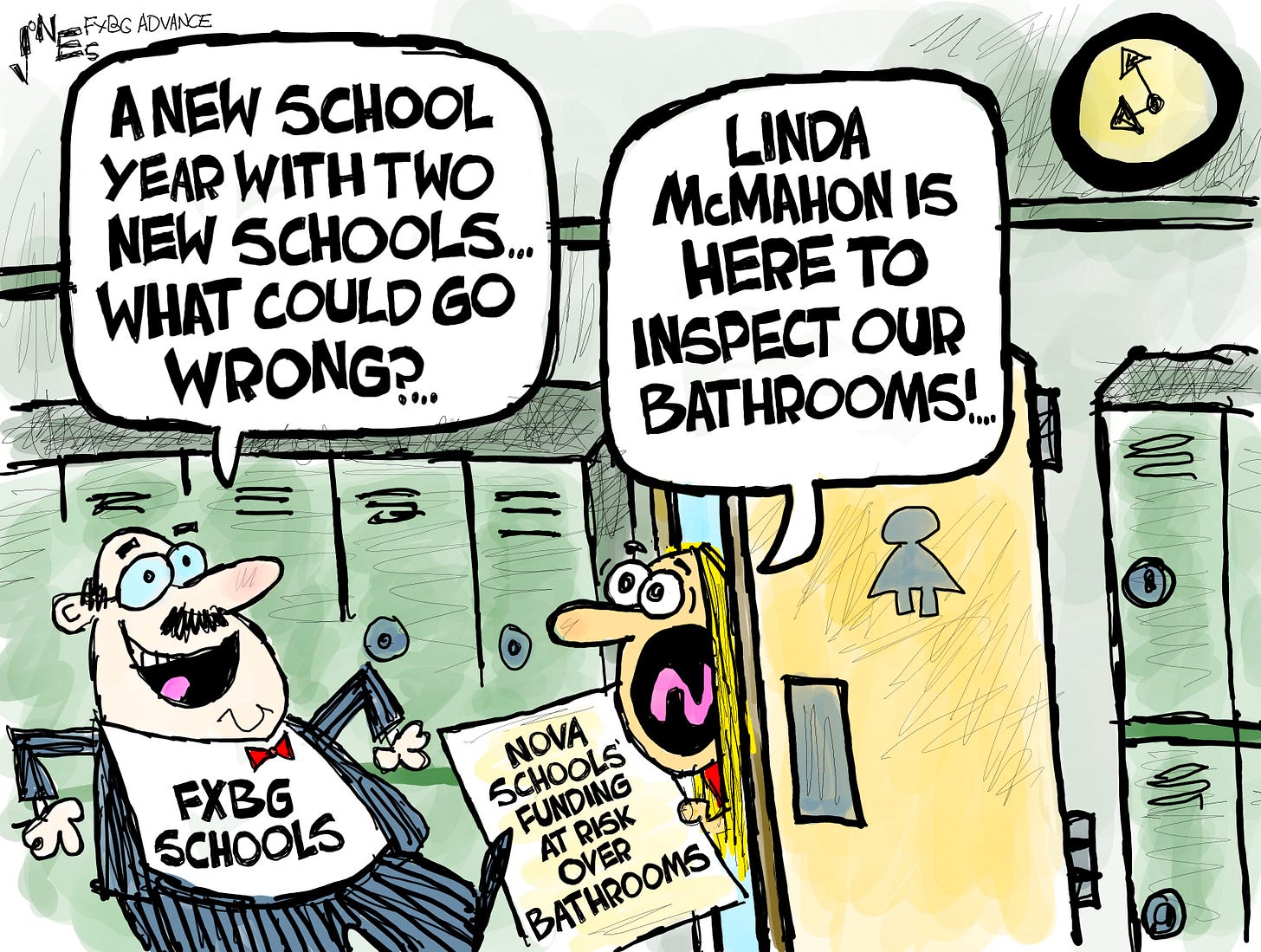 The Advance wrote this to go with today’s cartoon: Fredericksburg City Schools had a tough summer (well, the School Board did, anyway), but there were some good things this year, like the opening of two new schools. What could possibly go wrong? Well, when the new U.S. Education Secretary’s experience for the job is being able to distinguish a Camel Clutch from a Cobra Clutch, and her idea of a towering academic intellectual is Hulk Hogan, a lot. Yes, the Trump Administration specializes in hiring — how should I put this kindly — less-than-smart people to lead federal agencies. So rather than ‘rassling’ with serious education issues, we spend our time banning every book with a black face on it and having freak-outs about bathrooms. Yeah, that’s gonna make America great. Just ask Clay Jones.