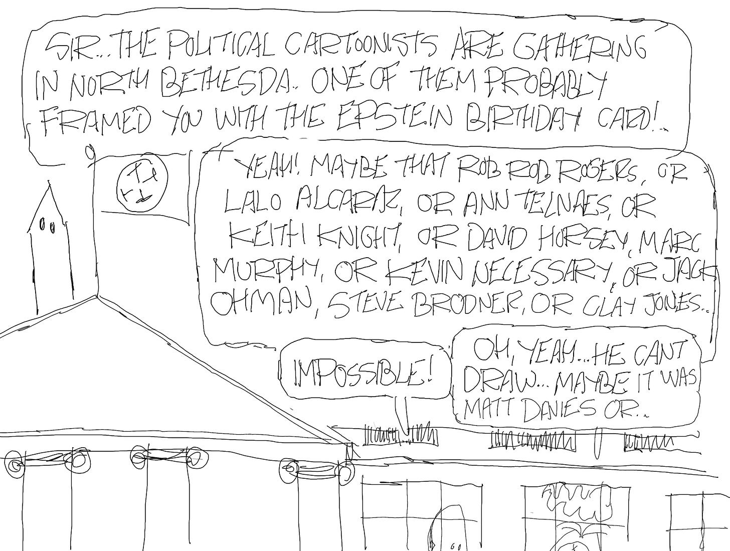 I’m in North Bethesda, Maryland for my cartoonist association’s annual convention today, and that’s why I got ahead with work. But I’m going to post stuff about the convention while I’m there. I plan to do at least one Zoom conversation with another cartoonist while at the convention. And today, you’re getting a blog of roughs.