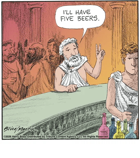This Toonist Has Been On Fire Funny This Week! I guess. Today is the second day I’ve gotten to it, and it’s a real lol-er. https://www.gocomics.com/bliss/2026/01/30 Share this: Share on X (Opens in new window) X Share on Facebook (Opens in new window) Facebook More Print (Opens in new window) Print Share on Reddit (Opens in new window) Reddit Share on Tumblr (Opens in new window) Tumblr Share on Pinterest (Opens in new window) Pinterest Share on Pocket (Opens in new window) Pocket Share on Telegram (Opens in new window) Telegram Share on WhatsApp (Opens in new window) WhatsApp Like Loading... Related Published by ali redford I love dogs and people. I want living creatures to thrive. I love to cook, and share the food, but ya gotta get in line in front of the dog. View all posts by ali redford