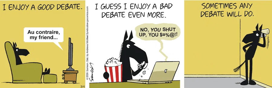 Yawn. Wednesday https://www.gocomics.com/darksideofthehorse/2026/03/04 Share this: Share on X (Opens in new window) X Share on Facebook (Opens in new window) Facebook More Print (Opens in new window) Print Share on Reddit (Opens in new window) Reddit Share on Tumblr (Opens in new window) Tumblr Share on Pinterest (Opens in new window) Pinterest Share on Telegram (Opens in new window) Telegram Share on WhatsApp (Opens in new window) WhatsApp Like Loading... Related Published by ali redford I love dogs and people. I want living creatures to thrive. I love to cook, and share the food, but ya gotta get in line in front of the dog. View all posts by ali redford