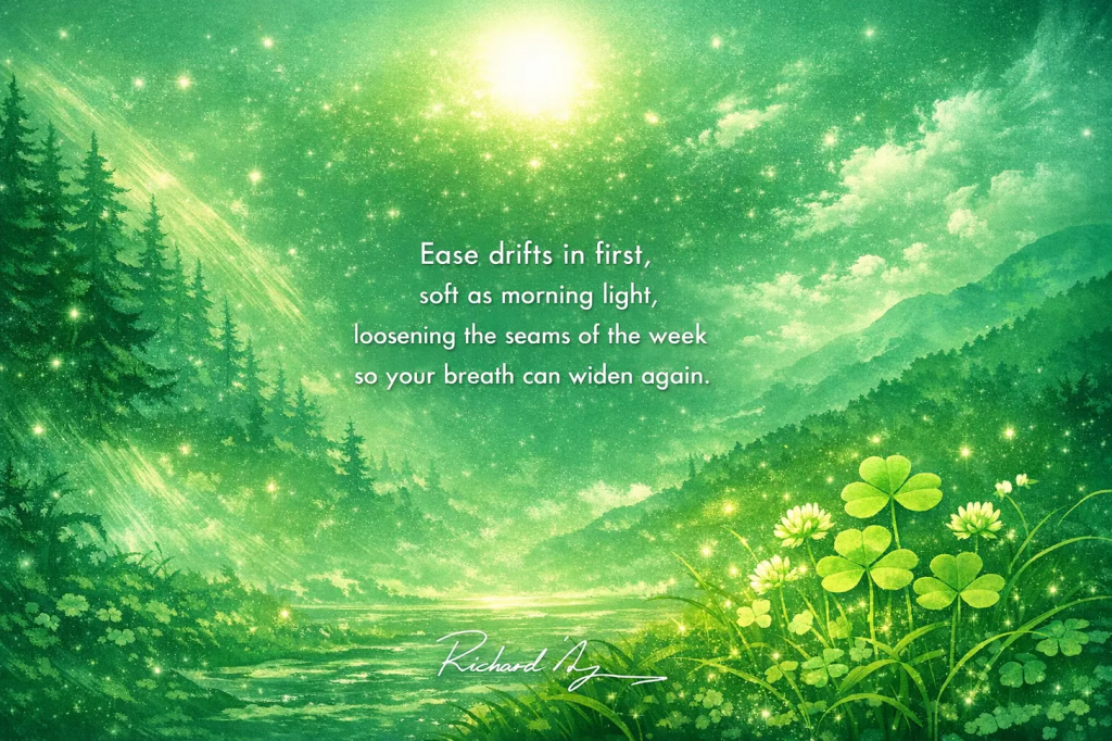 O come now, friend, and rest your bones, the week’s been fierce and long; but Ease comes stepping down the lane to hum you its soft song. A Lantern glows along the path, a stubborn, golden spark; the kind our grandfolks swore was left to guide us through the dark. Stillness drapes its woolen shawl around your weary frame; it whispers like an old seanchaí who’s long forgotten blame. The Hearth is warm for wanderers, its welcome deep and wide; it keeps a chair for every soul the world has weathered tired. Then Solace pours a quiet cup the colour of the dawn; it doesn’t ask what burdens ache— it simply sits till they’re gone. Your Breath returns like gentle rain across an Irish hill; it fills the fields inside your chest and bids your heart be still. And Grace—ah sure, it comes uncalled, the way good blessings do; it settles on your shoulders light as morning’s silver dew. An Ember glows beneath it all, a spark that won’t give in; the same that warmed our ancestors through storm and winter’s din. So walk with Gentle in your step, let kindness be your guide; for those who move with softened hands find strength they need not hide. And Here you stand, upon the earth, your troubles set to rest; the world leans in a little close and wishes you its best.