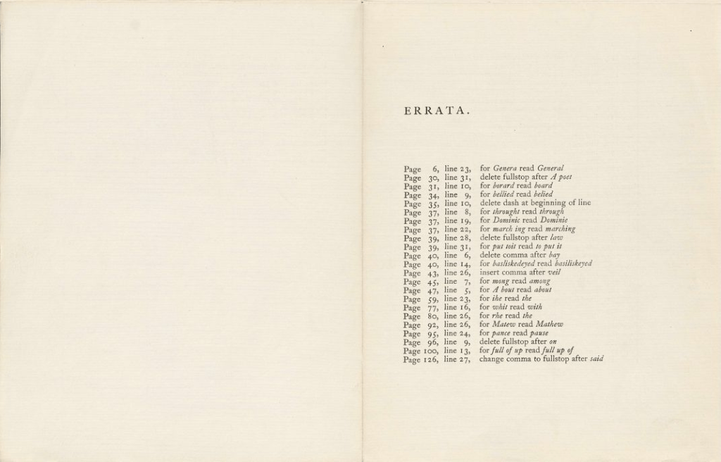 The following year, Joyce’s editors compiled a massive list of the book’s errors to be fixed in new editions. Joyce rejected some of the corrections, saying, “These are not misprints but beauties of my style hitherto undreamt of.” Even so, some future printings of the book came with a seven-page errata sheet listing more than 200 mistakes.