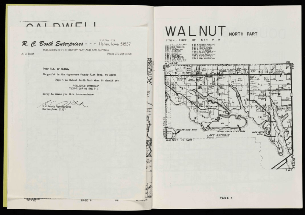 Many other errors, however, are simple mistakes. For example, the exhibition features a 1986 book of Iowa maps with a note correcting a mislabeled township. “Dear Sir, or Madam,” it reads, “We goofed in the Appanoose County Plat Book.”
