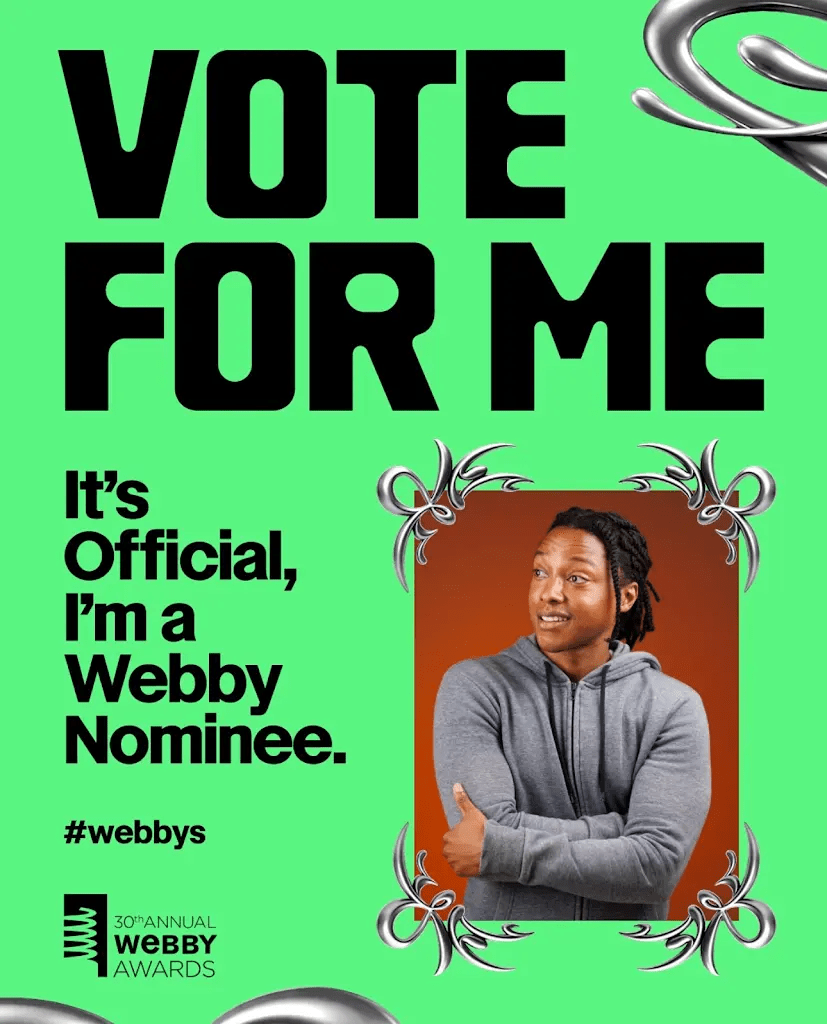Hi Friends, I have been nominated for ‪@TheWebbyAwards‬ and you can vote if you want me to win. https://vote.webbyawards.com/PublicVo… . I’ll also be hosting the awards this year which is truly wild. Thank you all so much for getting me here ❤️