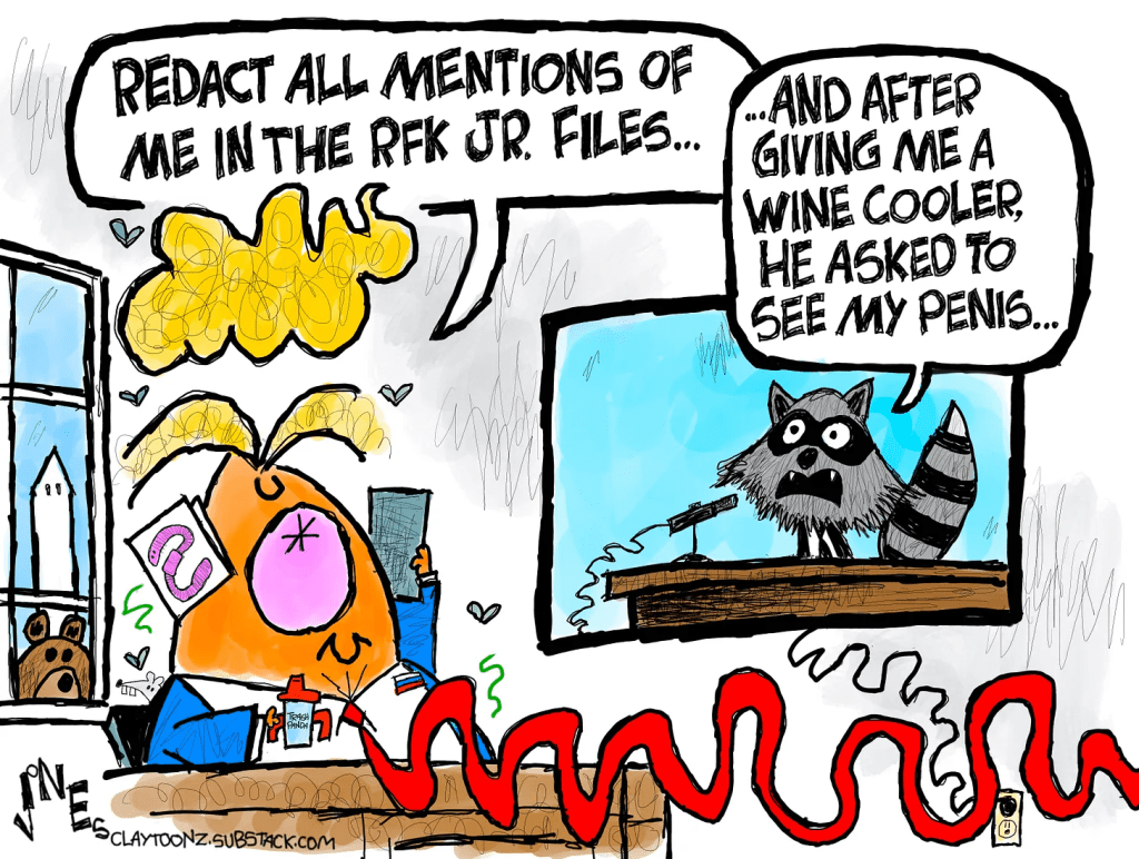 Robert F. Kennedy Jr, the worst US health secretary in our nation’s history, once cut the penis off a road-killed raccoon on the side of I-684 while his children waited in his car. I don’t know if this was during his cocaine addiction. (snip-MORE)