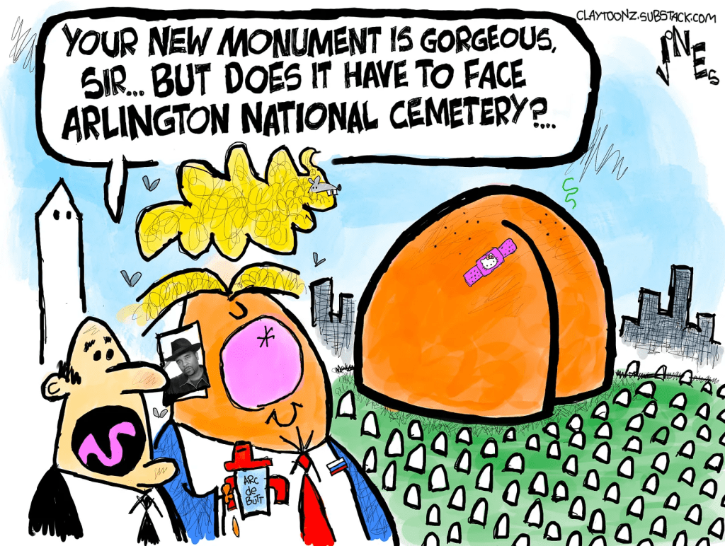 The original plans for this monument were for it to be 76 feet tall to symbolize the year of America’s founding, which, in case you were educated in a red state, was in 1776. Soon after, Trump insisted that it be taller than the Arc de Triomphe in Paris (he must’ve been standing next to Emmanuel Macron at the urinals), which stands roughly 164 feet tall. Eventually, Trump decided that the arch should rise to 250 feet, to celebrate America’s 250 years, making it what is believed to be the tallest triumphal arch in any of the world’s capital cities. (snip-MORE)