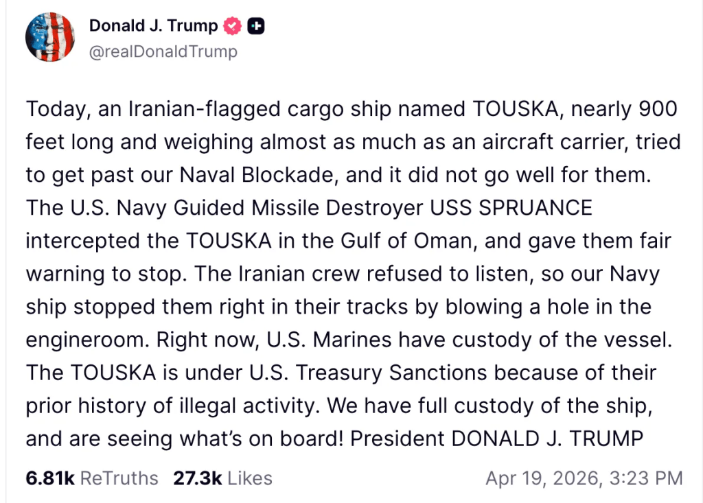 We seem doomed to another week of war news. On Sunday, Trump announced on Truth Social that the U.S. military seized an Iranian-flagged ship that he said tried to run the U.S. blockade in the Strait of Hormuz. Marines boarded the cargo ship Touska after it was disabled. Trump posted that the USS Spruance “gave them fair warning to stop,” but that “The Iranian crew refused to listen, so our Navy ship stopped them right in their tracks by blowing a hole in the engineroom.”