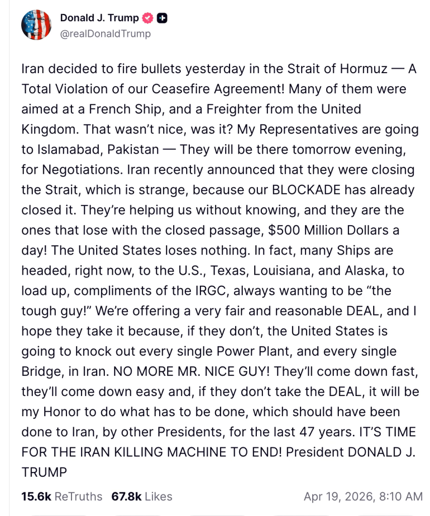 Notice how Trump speaks in the language of an all-powerful businessman, a CEO without a board to tell him what to do. He is sending “My Representatives” to Pakistan and “if they (Iran) don’t take the DEAL,” he’ll do “what has to be done.” It’s crazy on steroids, and well past the point where even his own party should be giving him a pass. The president of the United States is threatening to bomb civilian targets and devastate a civilian population. War crimes, plain and simple.