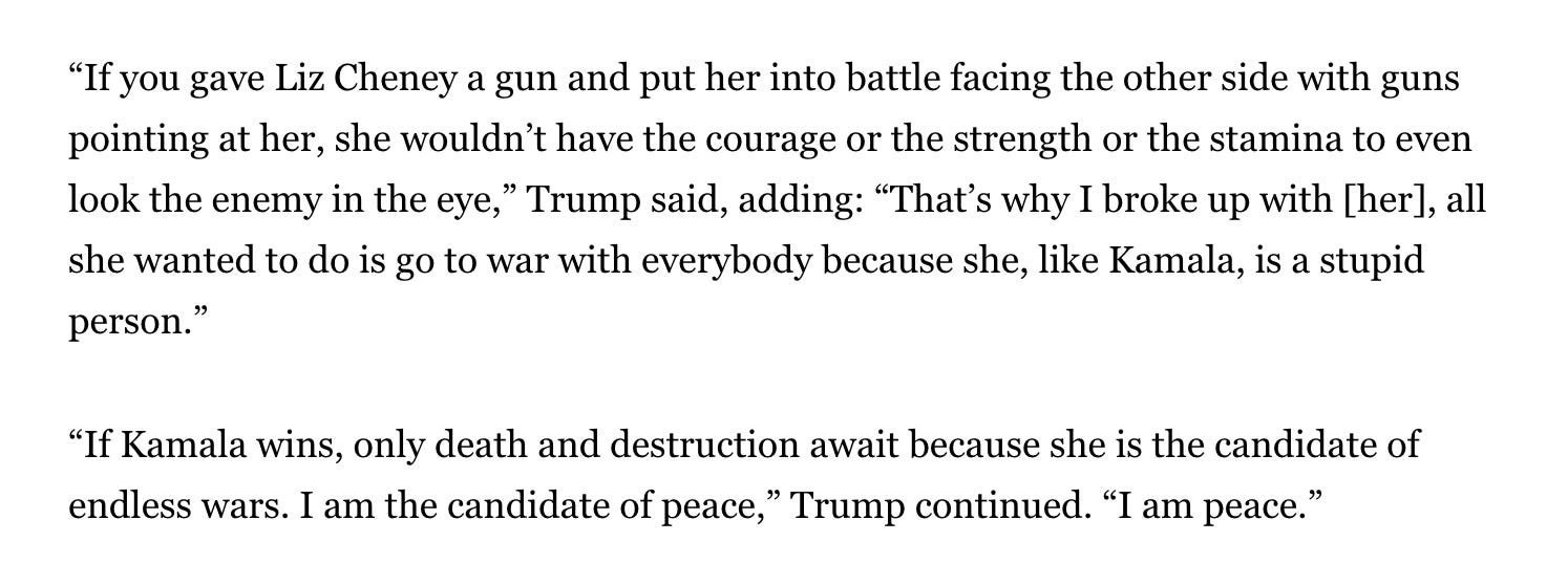 All of this from the candidate who, in November of 2024, in the closing days of his campaign for the White House, said that “If Kamala wins, only death and destruction await because she is the candidate of endless wars. I am the candidate of peace.”