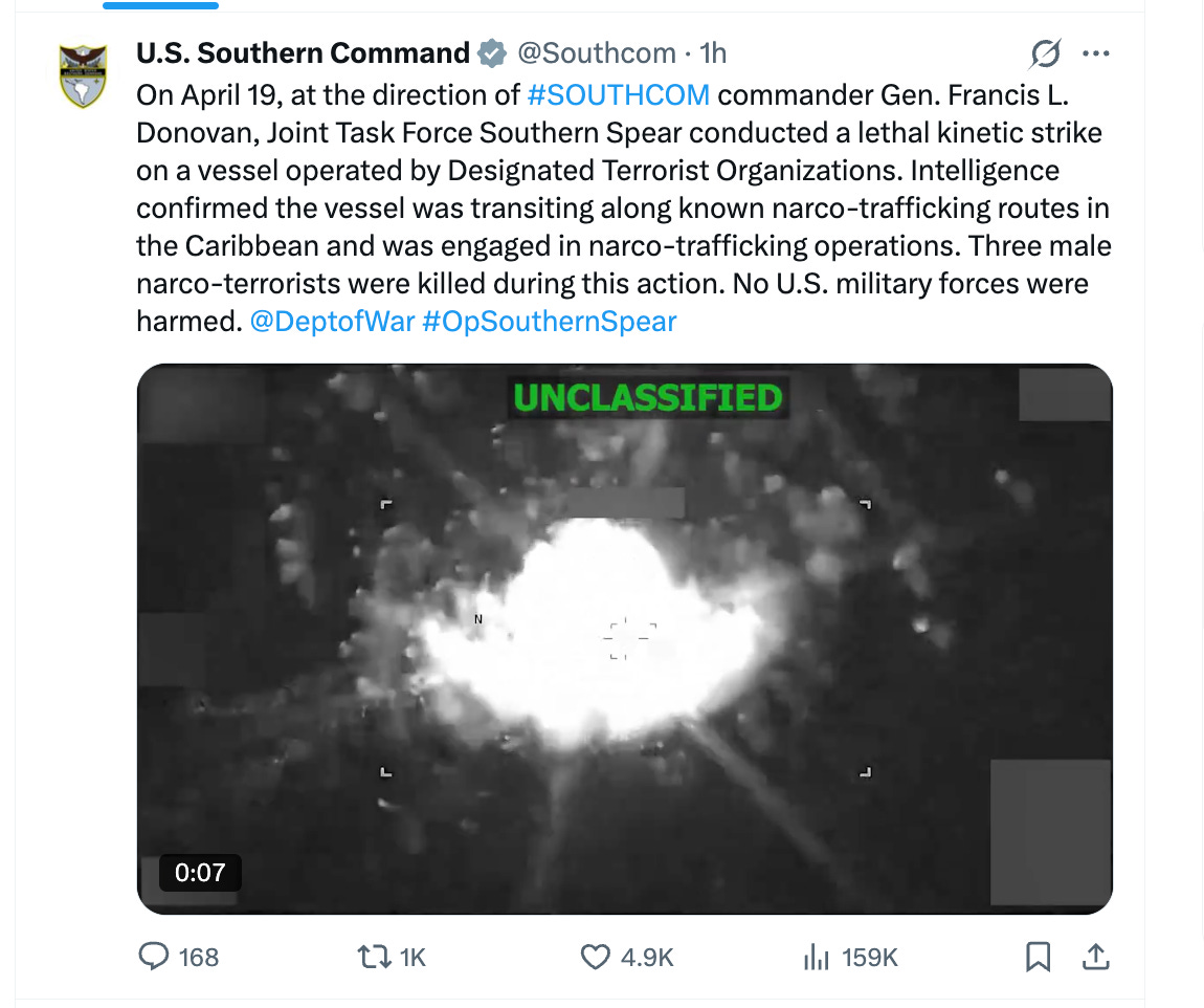 Today, the United States struck yet another vessel in the Caribbean. Three people were killed. The U.S. Southern Command account on Twitter said they were narco-terrorists. These attacks used to be shocking. Now, they barely garner notice. As of the last strike, four days ago, Reuters reported the death toll was “over 170.” Three people were killed in that strike last Wednesday, as well.