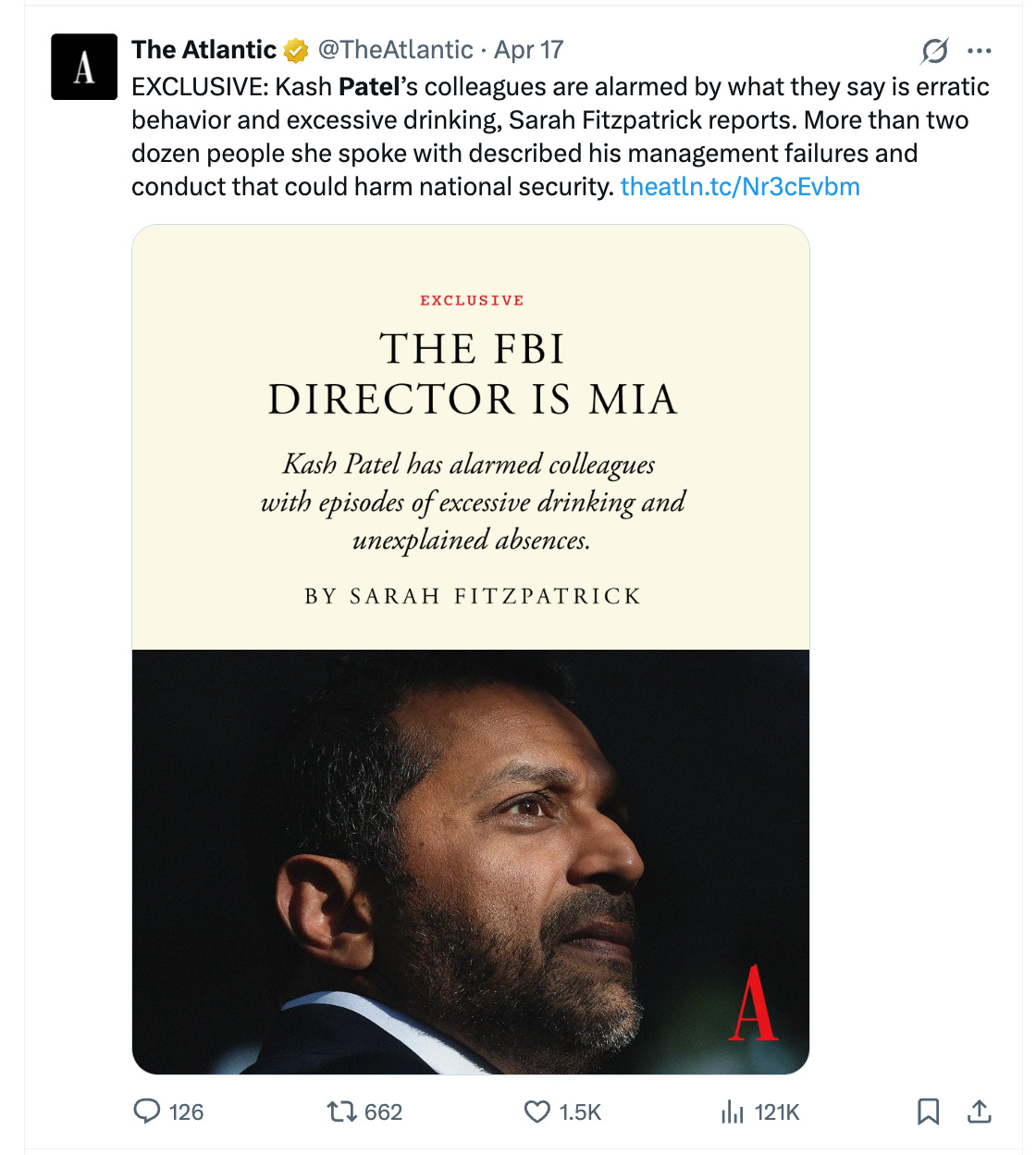 Also appearing on the Sunday shows, FBI Director Kash Patel said he would file a defamation case on Monday against The Atlantic, which reported last week, in a story headlined, “The FBI Director Is MIA,” that Patel’s colleagues are “alarmed” by “episodes of excessive drinking and unexplained absences.” Two dozen people interviewed for the story “described Patel’s tenure as a management failure and his personal behavior as a national-security vulnerability.”
