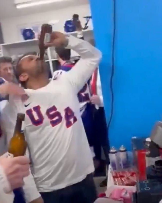 Screen grab of Patel “celebrating” with the U.S. Men’s Hockey team after their Olympic victory.