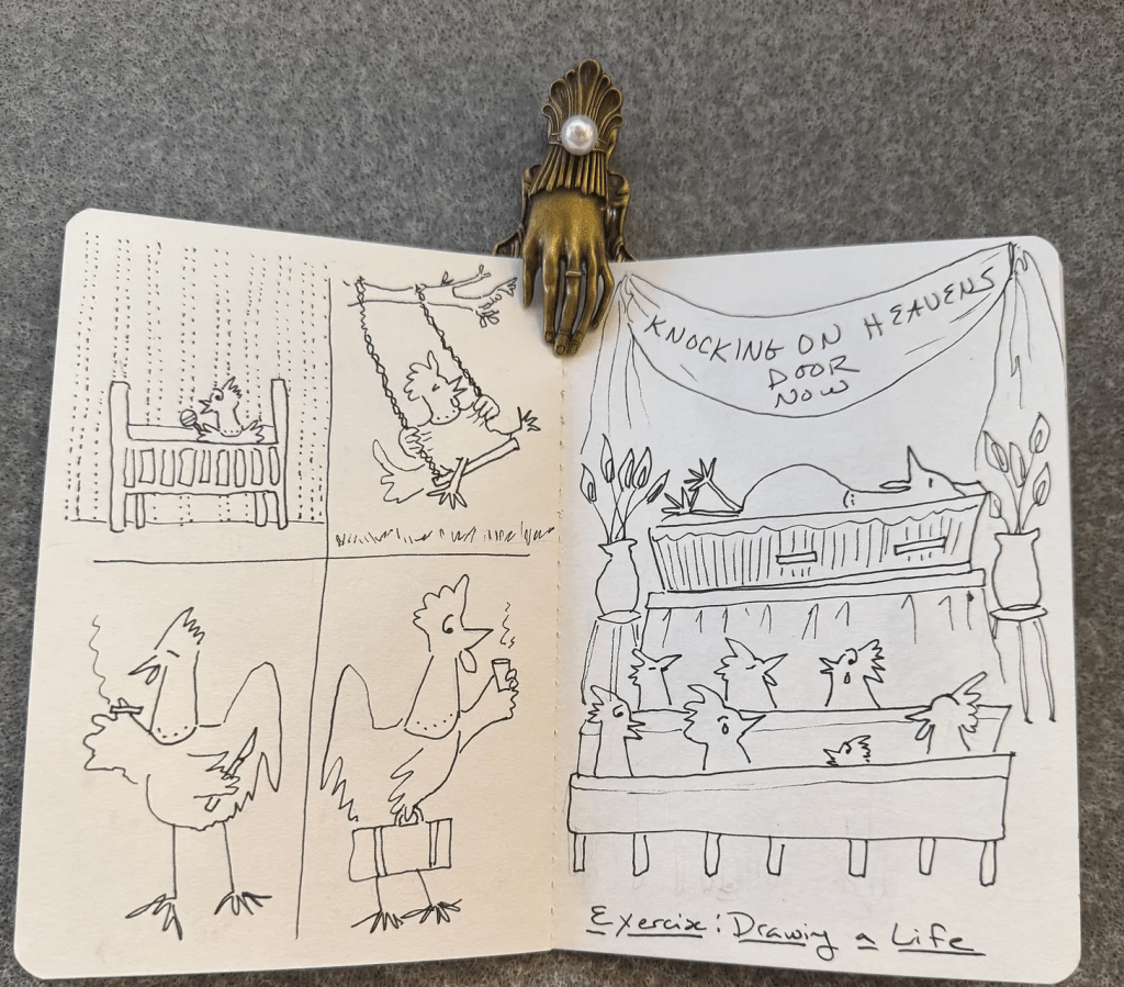 Another was to choose a character and sketch their entire life cycle. I chose Beyoncé the Giant Metal Chicken, obviously: