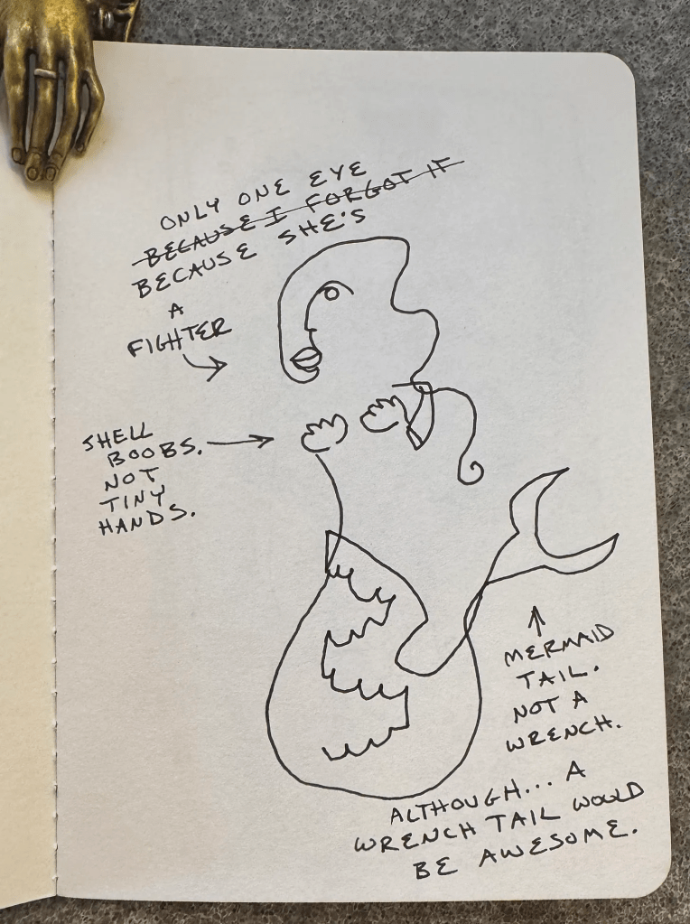 This week I revisited the Lynda Barry Making Comics book because I was on book tour and a tiny sketch book was easy to bring along on plane rides. The exercises were out of my comfort zone but sometimes I think that can be a good thing. This exercise was called “Close your eyes and draw a mermaid.”