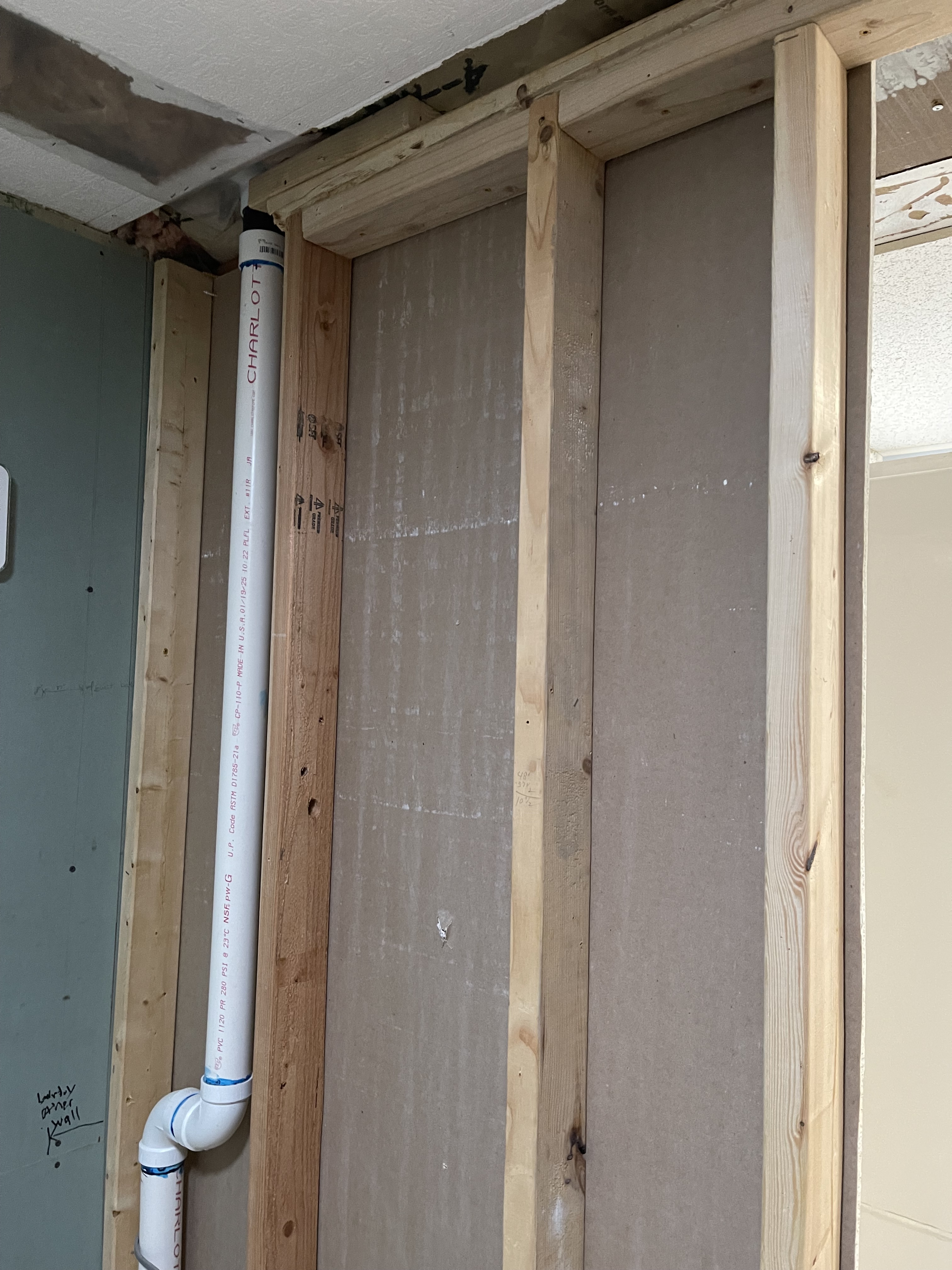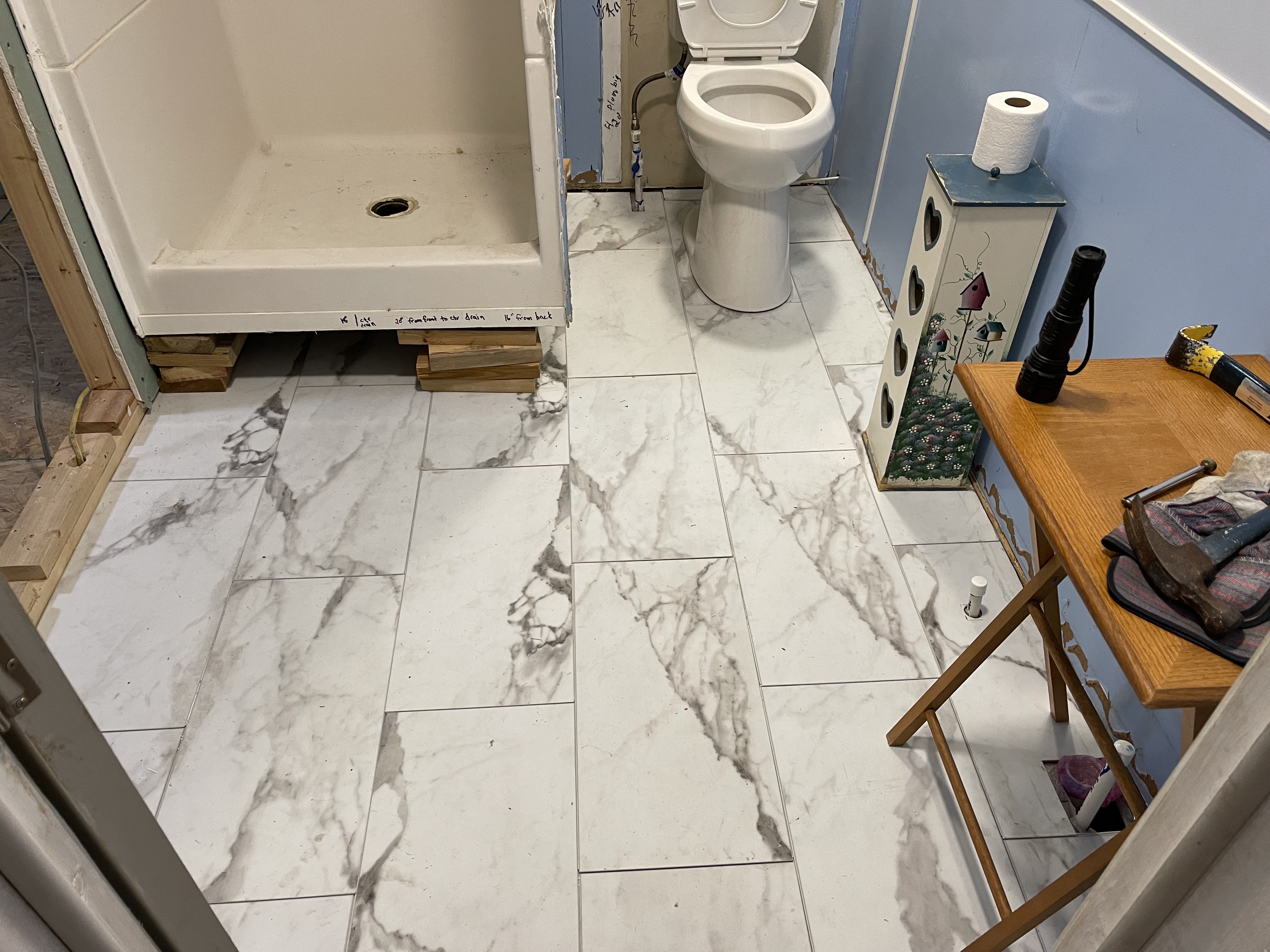 On the bathroom well all good plans of … Ron got the pipes in for the water lines both hot and cold also the shower drain, we got the toilet taken off, the new floor put down which due to the tiles no locking heeded to be glued with corners ones being brad nailed, the toilet replaced with a new seal. All good. Ron rechecked his measurements and we even set the shower where he wanted it to check the alignment of the water and drain pipes. We moved the shower back out and Ron built half the wall going across the two bathrooms and which would be the side wall of the shower. He installed the vent pipe in the wall. He ran the electric needed for the exhaust fan through the 2x4s.